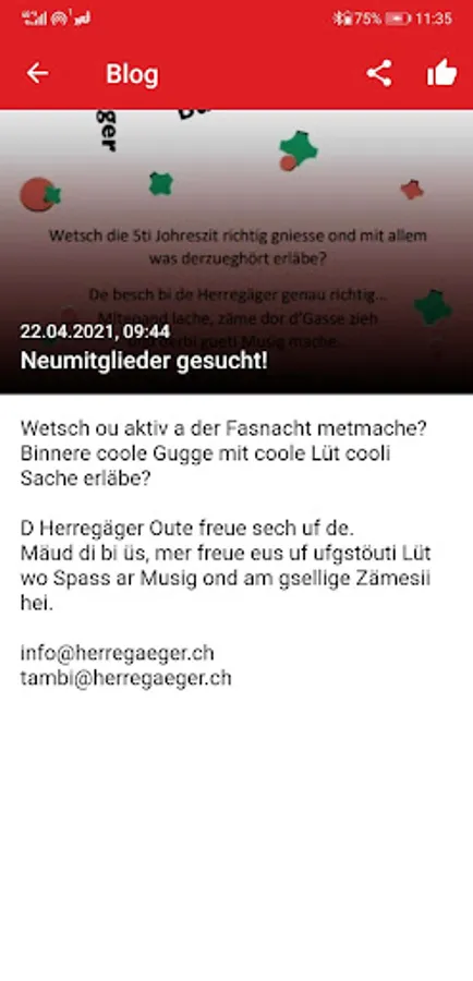 The mobile app of the Guggenmusik Herregäger from Olten offers insight into the exciting club life and their commitments around the Olten carnival. Not only the carnival participants of the Oltner-Fasnacht, but also the entire carnival community and fan base of the Herregäger are informed directly and up-to-date about news.