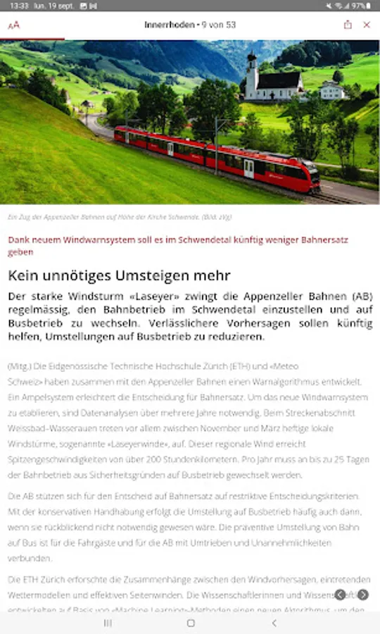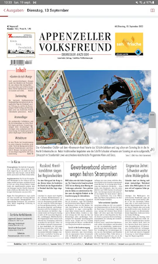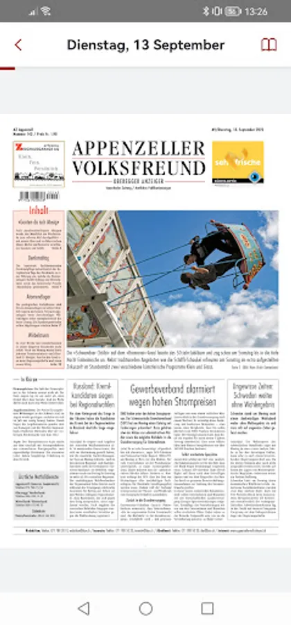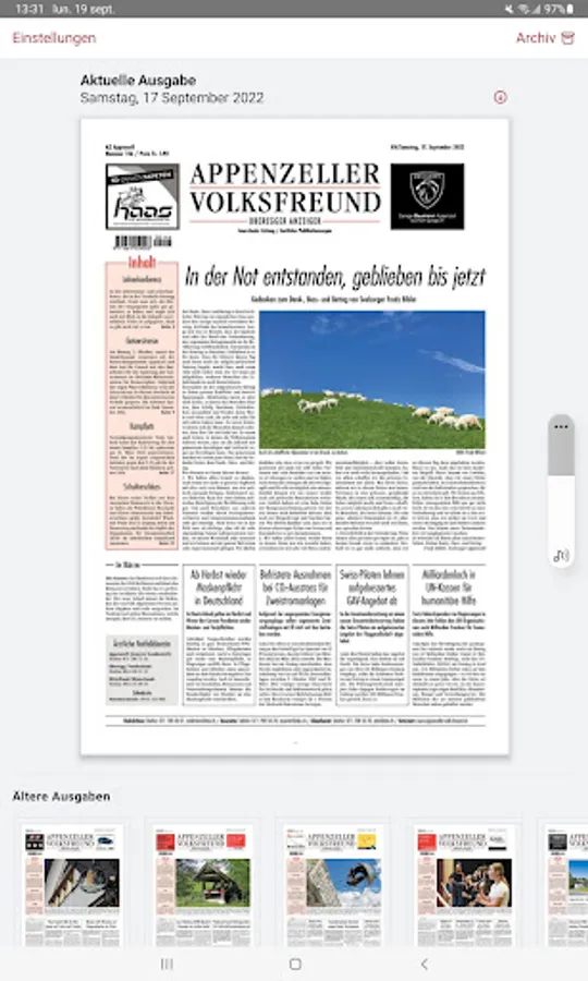 The “Appenzeller Volksfreund” app brings the latest local news and advertisements from the newspaper. News and advertisements are presented as in print, but with unique interactivity, which makes the content pleasant and easy to read. Subscribers have access to the archive of recent issues. The app is free to download. Your login details are required to use and display the content. If you are not yet an ePaper subscriber, you can find further information at http://www.appenzeller-volksfreund.ch or directly from our subscription service (abo@dav.ch or Tel. 071 788 50 20).