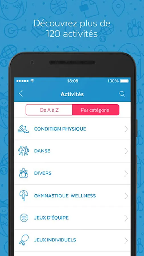 - Categories: fitness, dancing, wellness gymnastics, team games, individual games, water sports, winter sports, combat sports, individual sports and techniques.