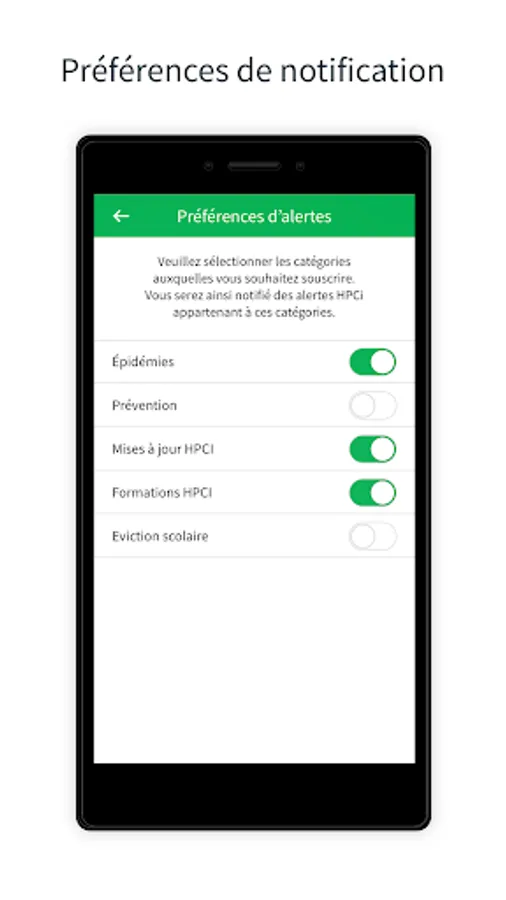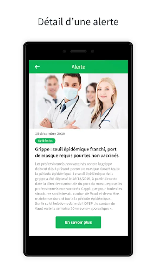Designed for health professionals, this application allows you to receive cantonal alerts on epidemics, prevention, training, HPCI documentation or school eviction of children, in order to:
