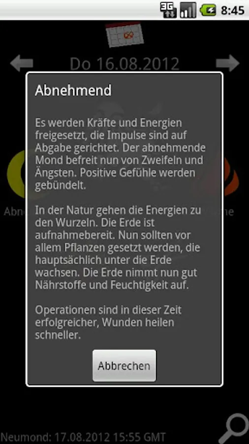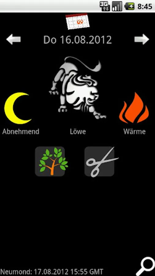 In addition to the zodiac, the moon phase and date/time of next new- fullmoon and the element can you find the information on health, hygiene and gardeningon at a glanc in the simply designed user interface. Selecting one of the icons to open up further details.