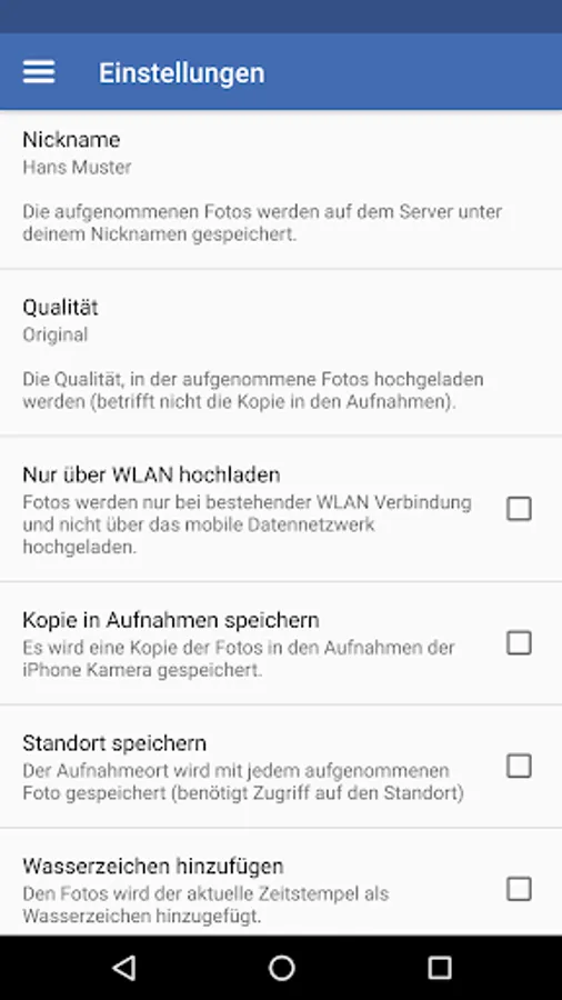 The CloudCam app saves photos immediately after preparation directly in the cloud. This app is designed for companies and organizations in which employees have to create for documentation purposes with their smartphone photos from the road (for example, construction sites, claims, etc.). Thanks CloudCam photos are accessible within a few seconds for the entire organization, so no manual and tedious syncing. The following settings are available within the app: