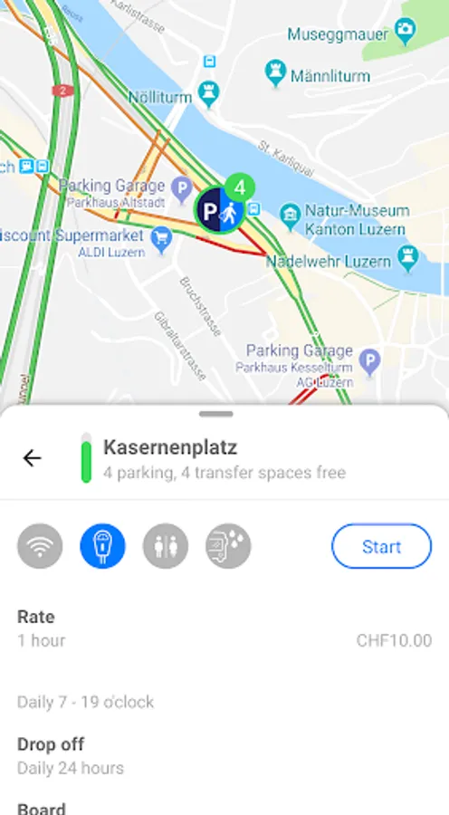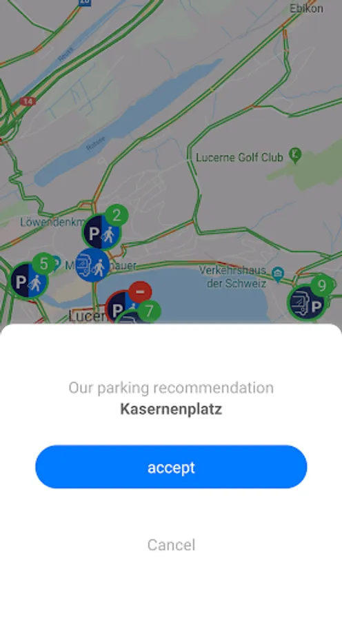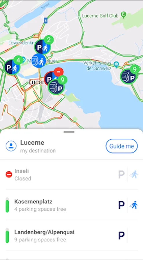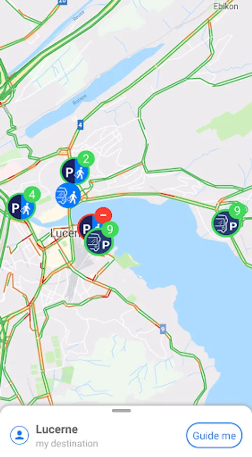 The "iParkiere Bus" app is the national navigation application for coach drivers in Switzerland. An intelligent routing algorithm allows bus tourists to be efficiently directed to the desired destination. With just a few clicks, coach drivers can find available stopping points and parking spaces in the city they are approaching. The current occupancy of the parking spaces is displayed in real time and supports drivers in their search for a parking space or a stop option. This enables coach drivers to reach their destinations more quickly and easily, reducing search traffic, relieving the traffic infrastructure and reducing CO2 emissions.