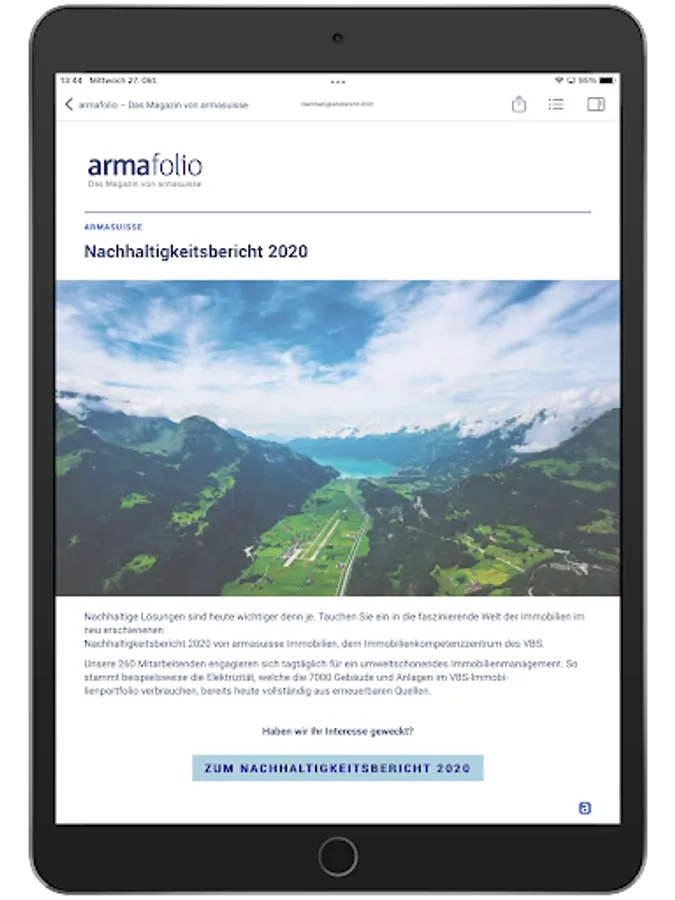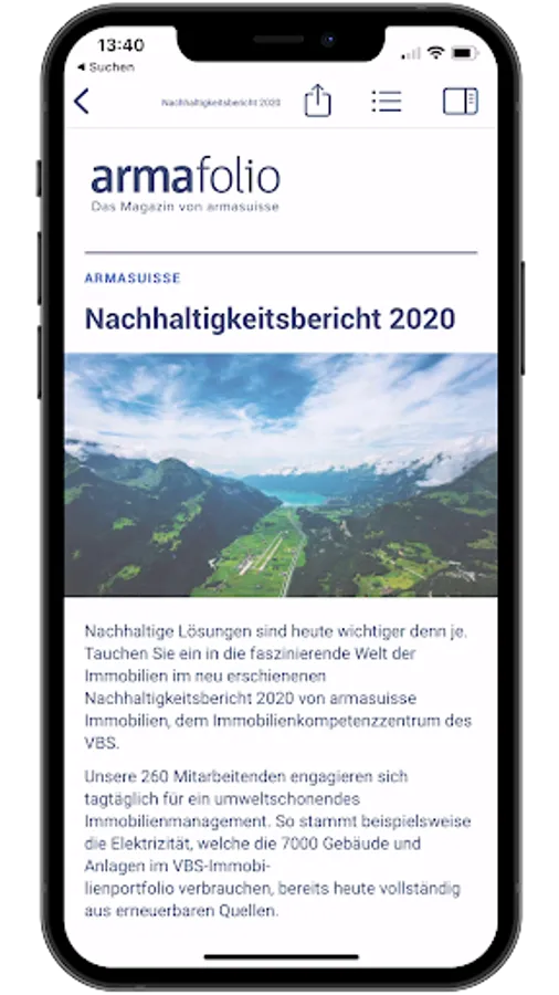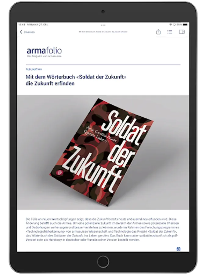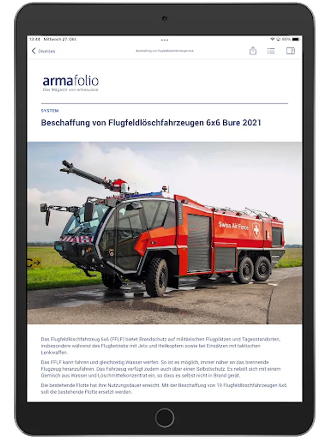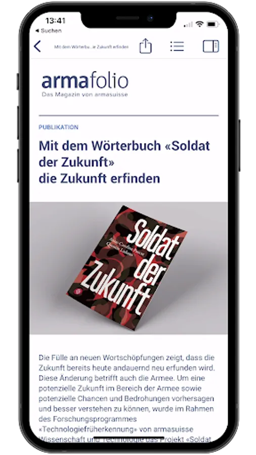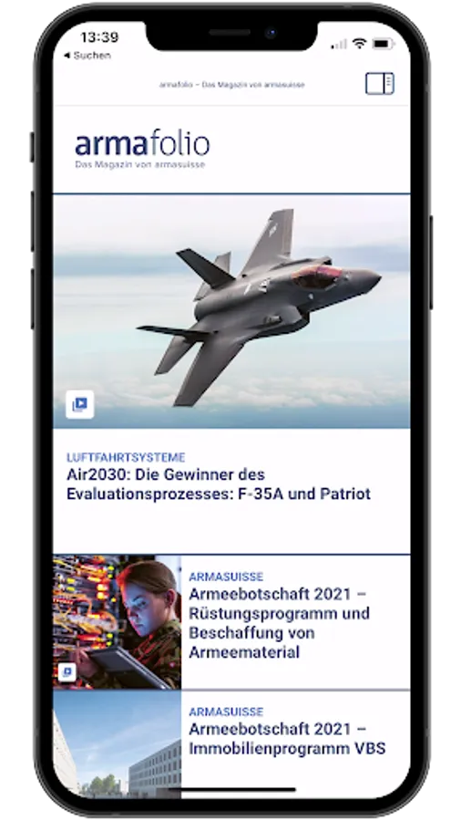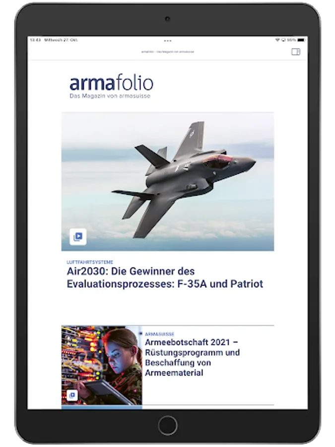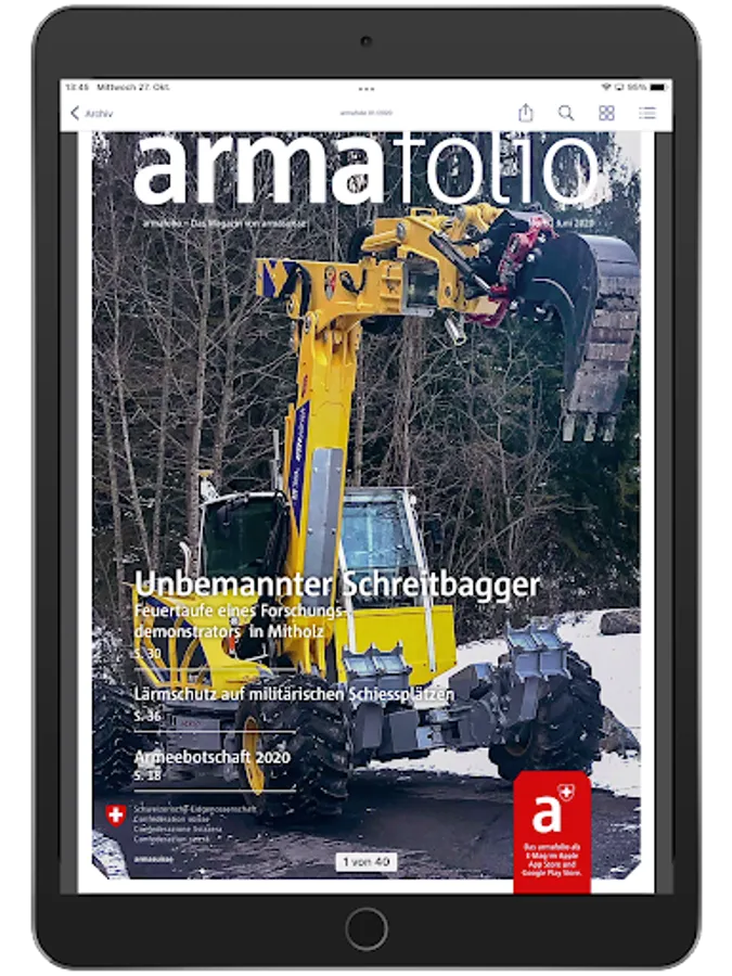 armafolio is the official magazine of the Federal Office for Armaments armasuisse. The magazine offers interesting multimedia reports on current armasuisse procurement projects, the development of systems and research in the armaments sector. With picture galleries, video and audio contributions, the digital magazine provides a varied mixture of information, illustration and entertainment. The magazine appears several times a year and contains news, portraits, interviews, reports and background stories.