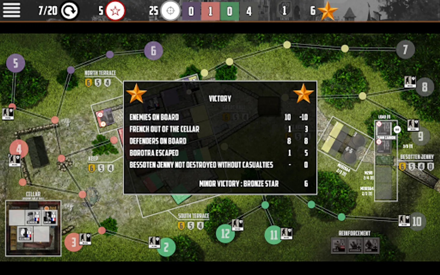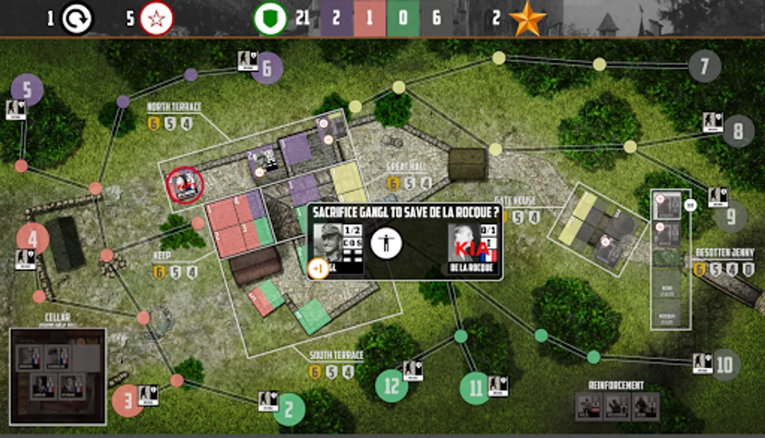 During a game of Castle Itter, you take the role of the force that defended the castle from on 5 May 1945. The goal of the game is to last until the SS deck is depleted, without allowing SS Counters to reach the castle. You score points for each Defender that survives the assault and lose points for each SS Counter remaining on the board at the end of the game - the higher your score, the better.