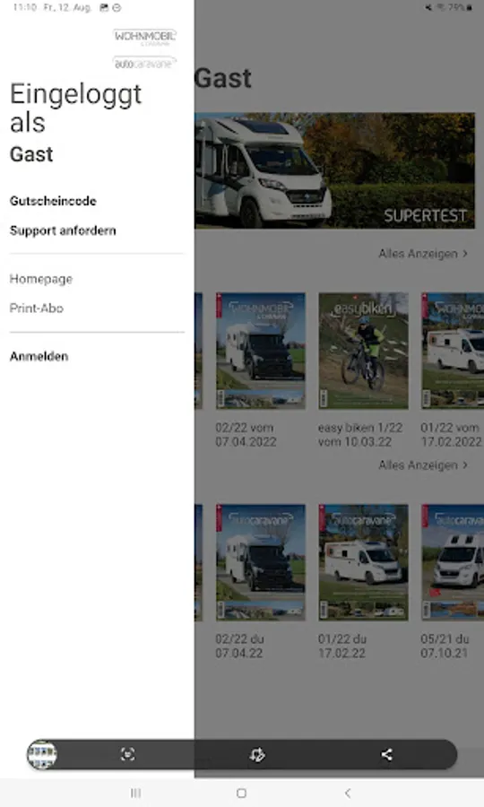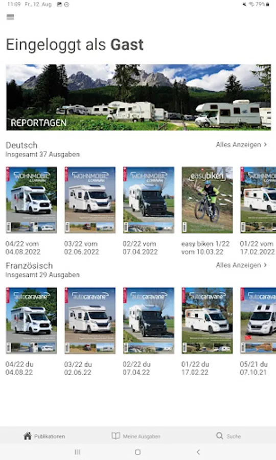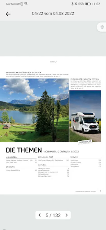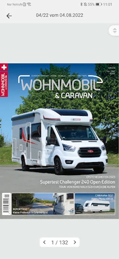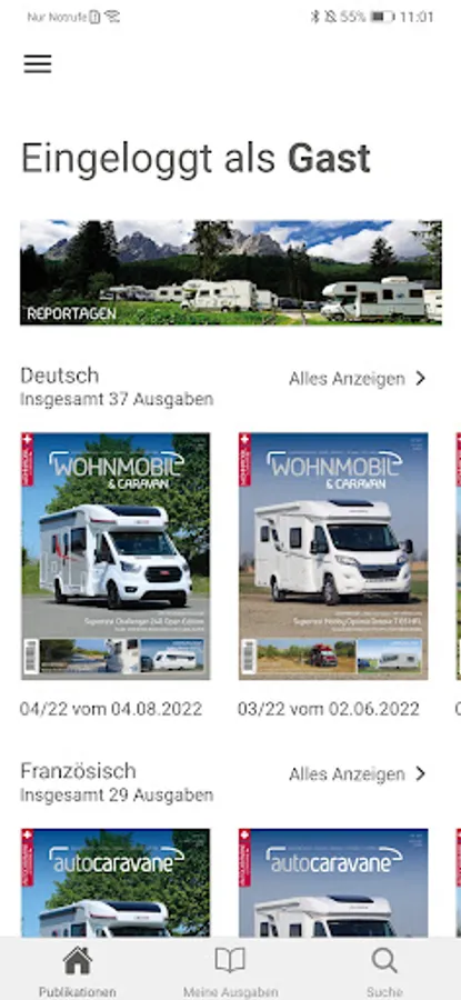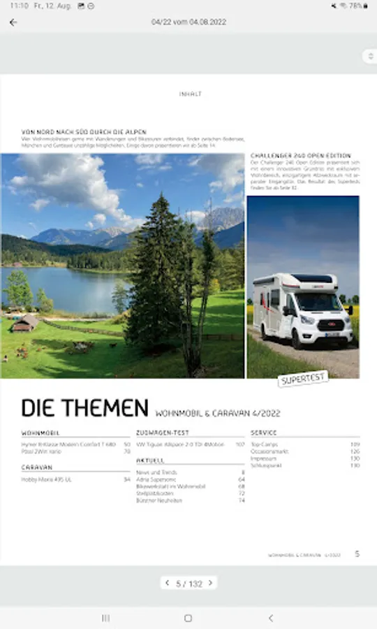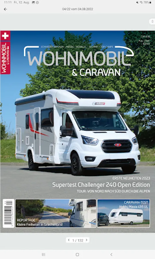 In the app you currently have access to the journal Single CAMPER & CARAVAN / CAR CARAVAN. In addition, there is the possibility (five editions) at a price of CHF to purchase an annual subscription 20:00, which automatically renews itself. The subscription is available in German and French.