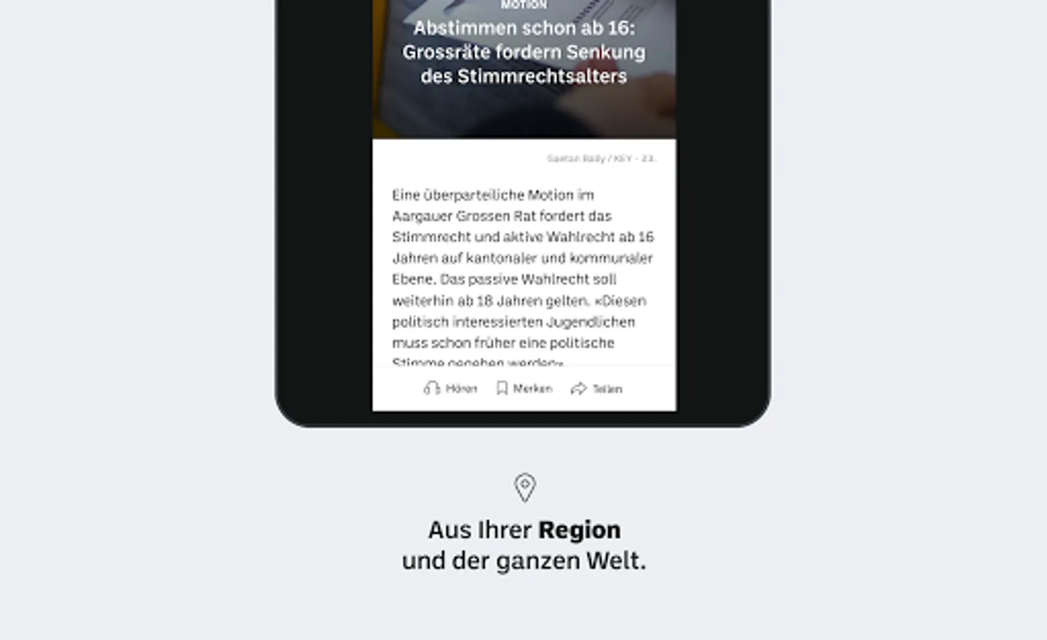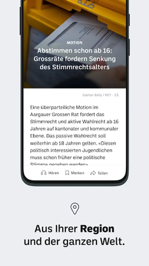 With the “Aargauer Zeitung” news app, you can stay up to date with the latest news from the canton of Aargau and your community while you are out and about. In addition to our regional content, we provide you with the most important news on a national and international level on a daily basis.