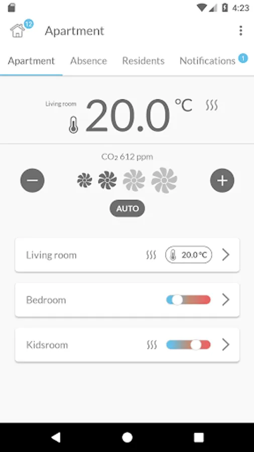 The system regulates the living room temperature allowing different ventilation levels to be set for your home. The App shows the current temperature in the living room. The temperatures of the other living spaces can be adjusted relatively to the living room. The system's variable ventilation can take place manually or automatically.