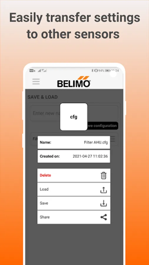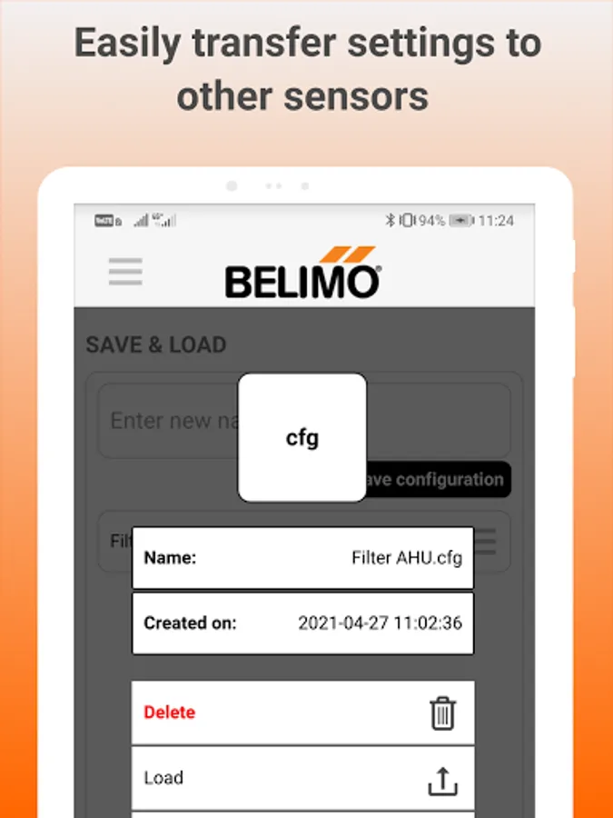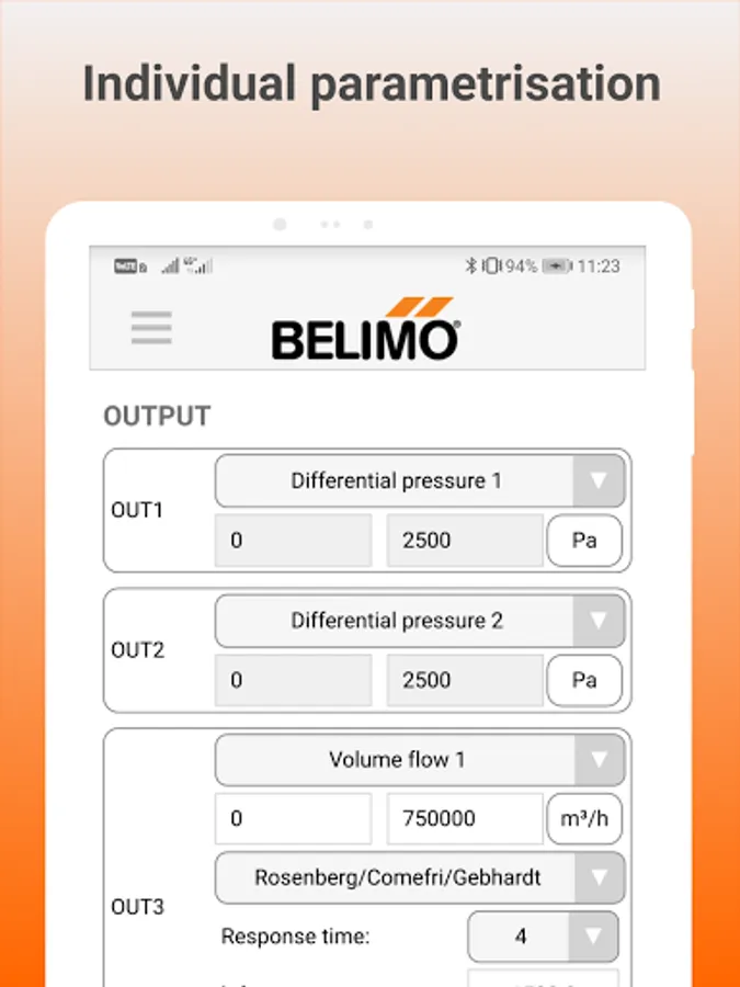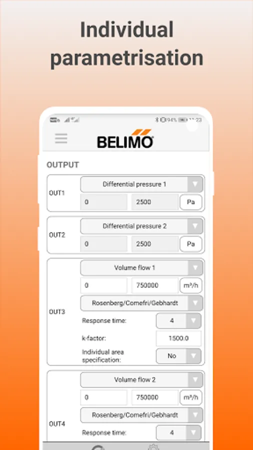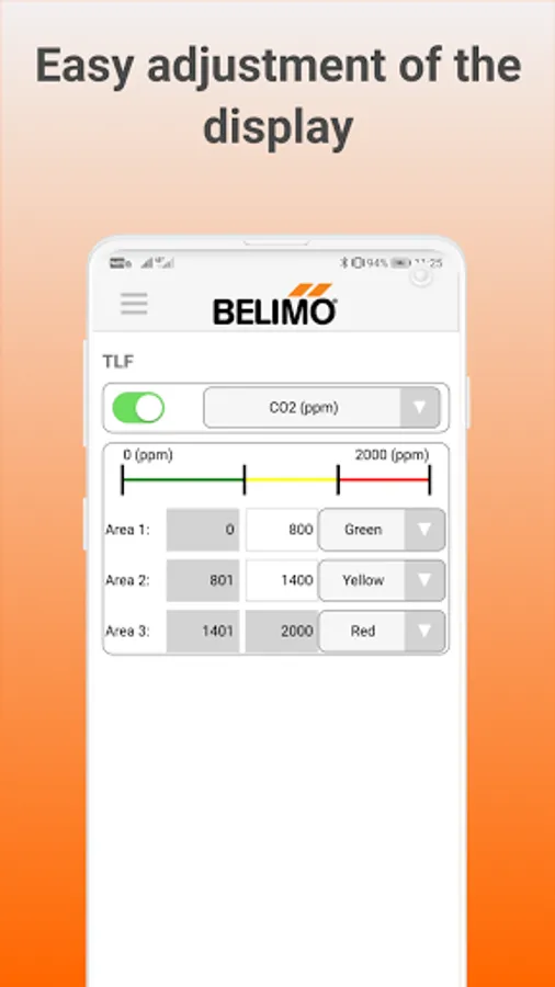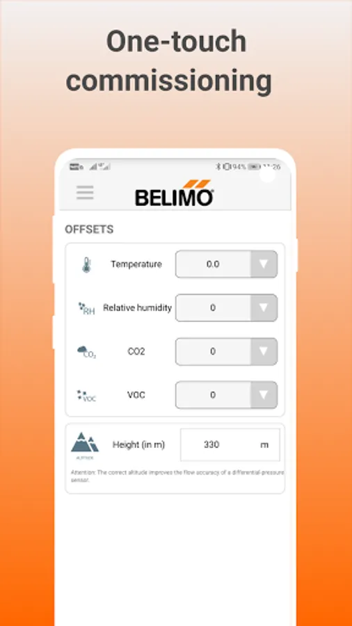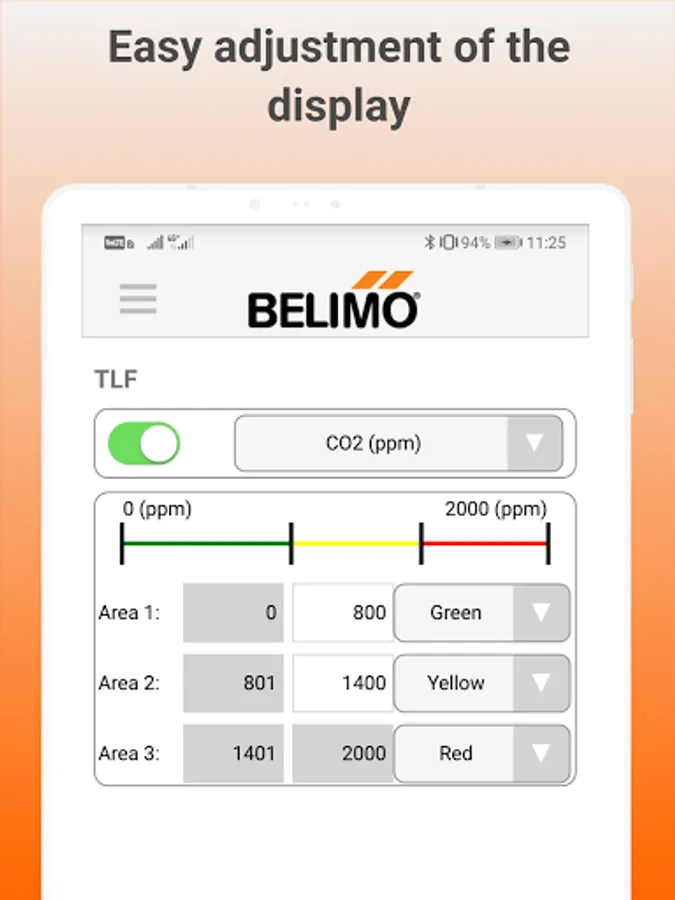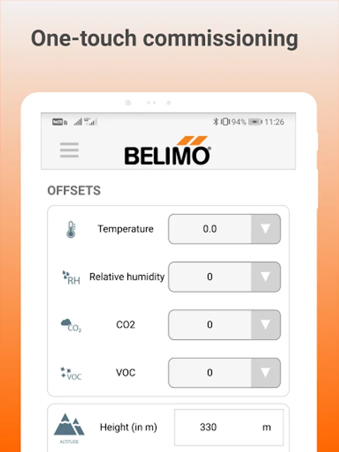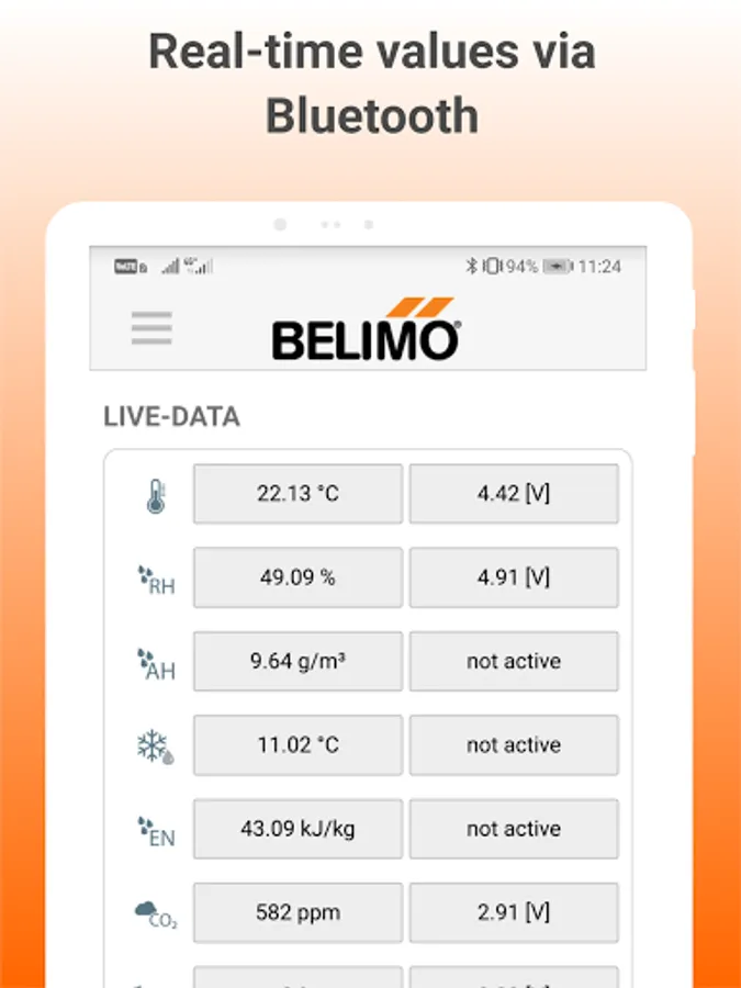 Via the Belimo Duct Sensor Assistant App it is possible to extend the range of use and to adapt the configuration individually to application requirements. A Bluetooth® dongle is required for configuration via the Belimo Duct Sensor Assistant App (sold separately, A-22G-A05).