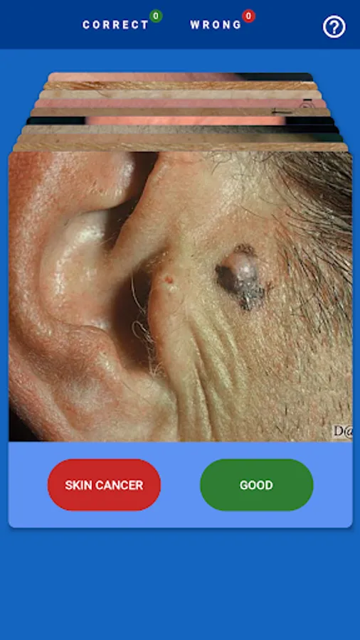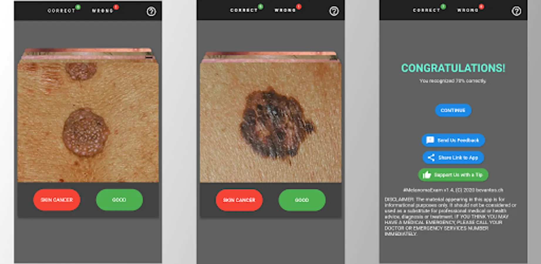 The goal of the #MelanomaExam app is to raise awareness of skin cancer. Just click the button or swipe the card if you think the image shows skin cancer and become sensitized for spotting potential skin cancer in the real world.