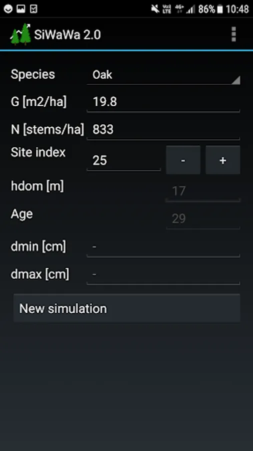 Few data are needed to use SiWaWa: the basal area per hectare (G), the number of stems per hectare (N), as well as the site index (SI) or the dominant height (h_dom). G, N and h_dom can be measured easily and rapidly in the forest, thanks to the MOTI app (also available on Google Play Store).