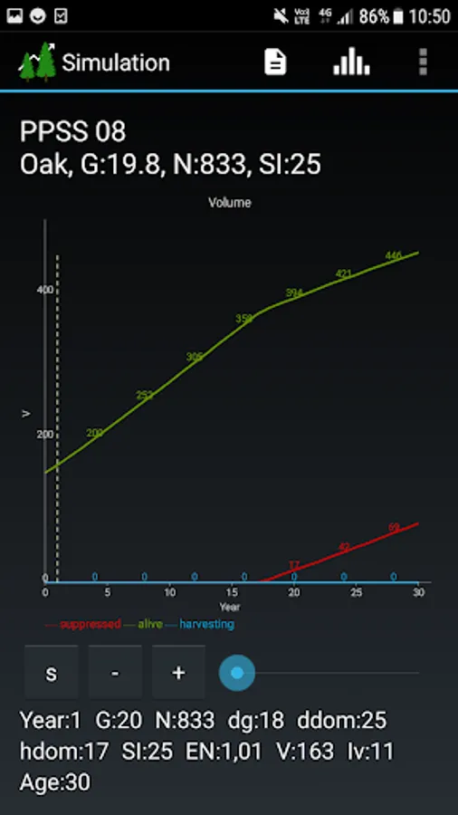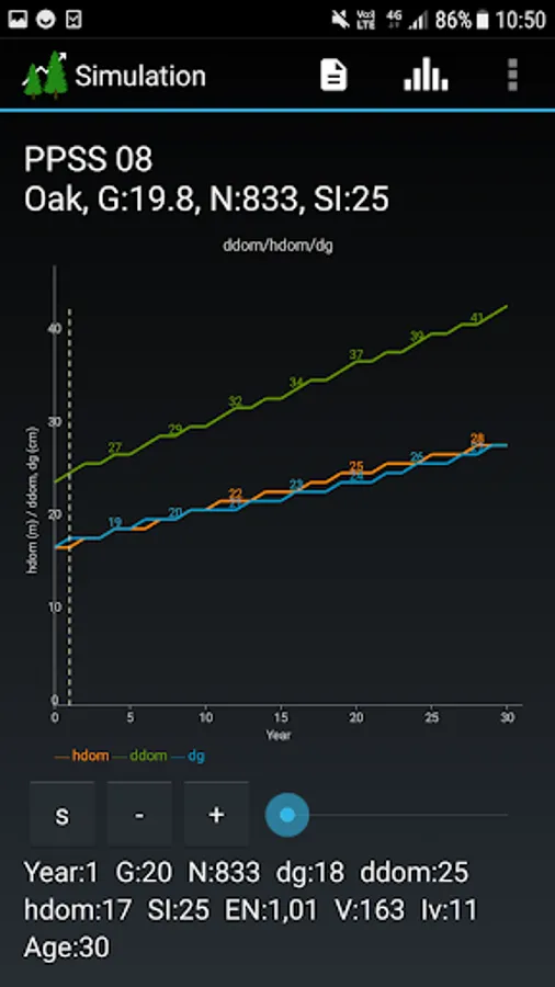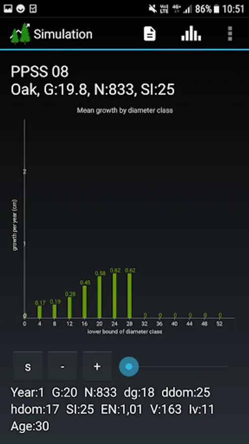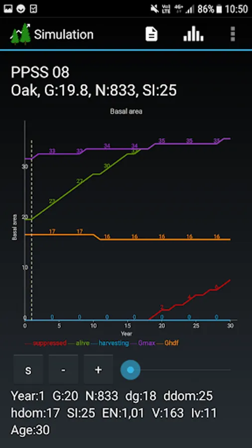 SiWaWa 2.0 provides also essential information on the stand density (G) and its evolution over time, and puts them into perspective with maximum density (G_max) and recommended density (G_rec) benchmarks. It thus offers a relevant basis for decision-making, in helping define appropriate moments for thinning the stand and determine the intensity of successive thinnings. The user can define different variants of interventions and compare them with each other. Results can be saved and exported for further analysis.