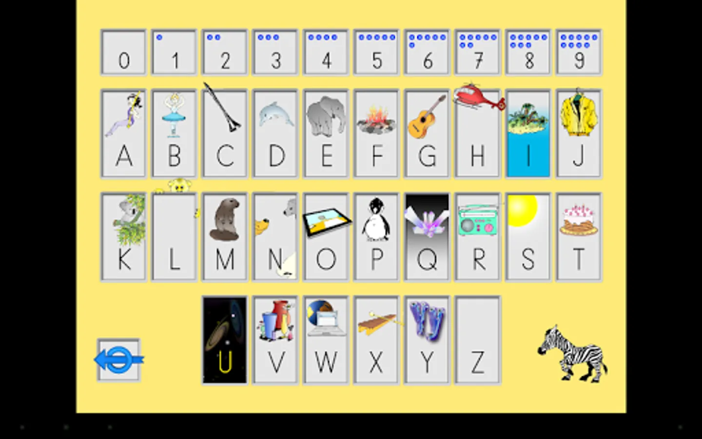On the output page (home) it is possible to determine, by means of a switch, if the work must be done with the "sound" or "name" letters. In addition, the learner must specify whether working with the left hand or the right hand.