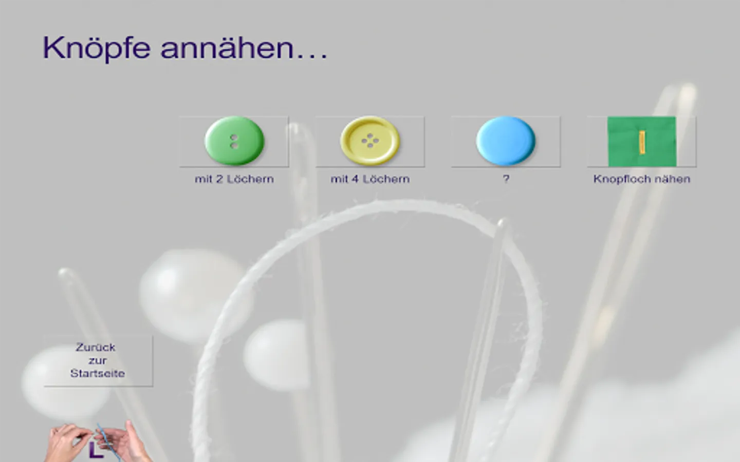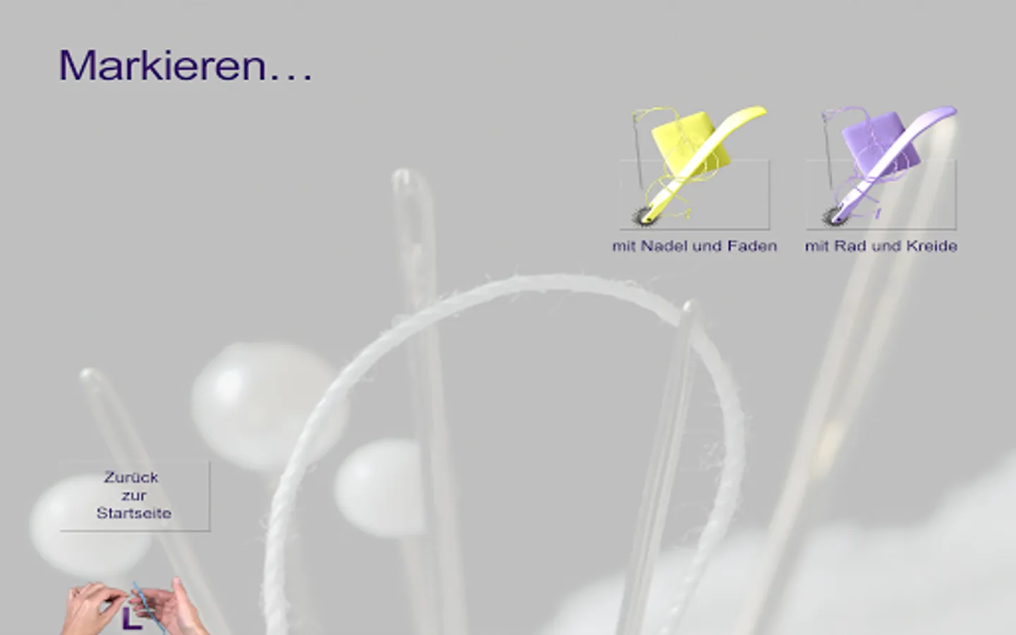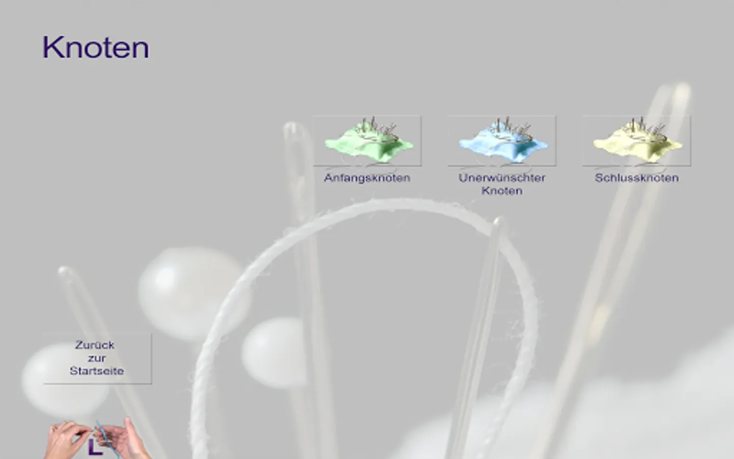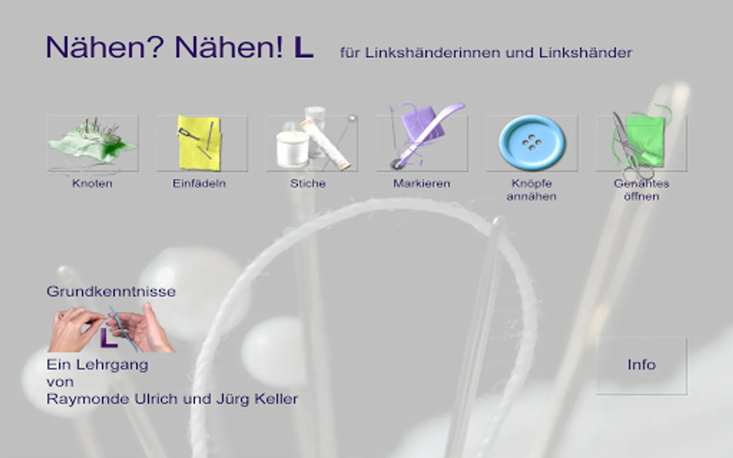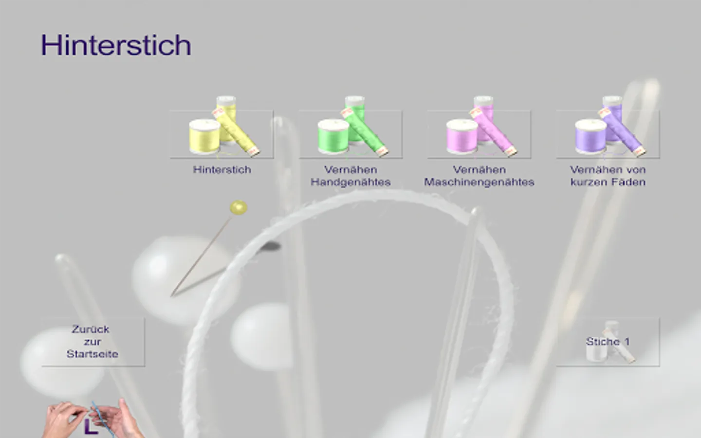 30 instructional films provide basic knowledge on the subject of “sewing by hand” for left-handers. The focus is on techniques that still have to be carried out by hand even when using the sewing machine, from the initial knot to the opening of the sewn.