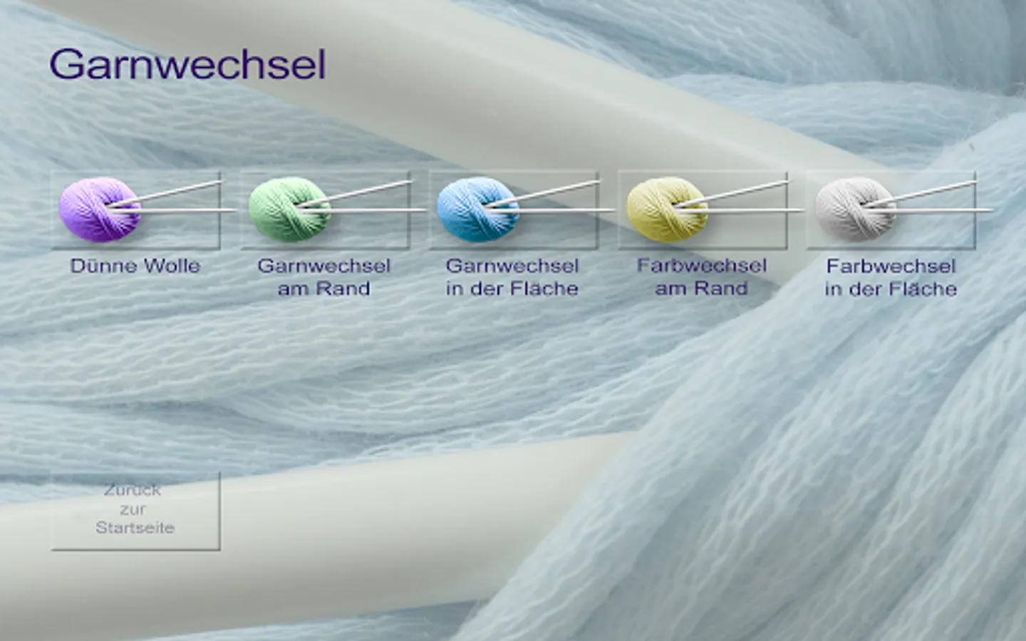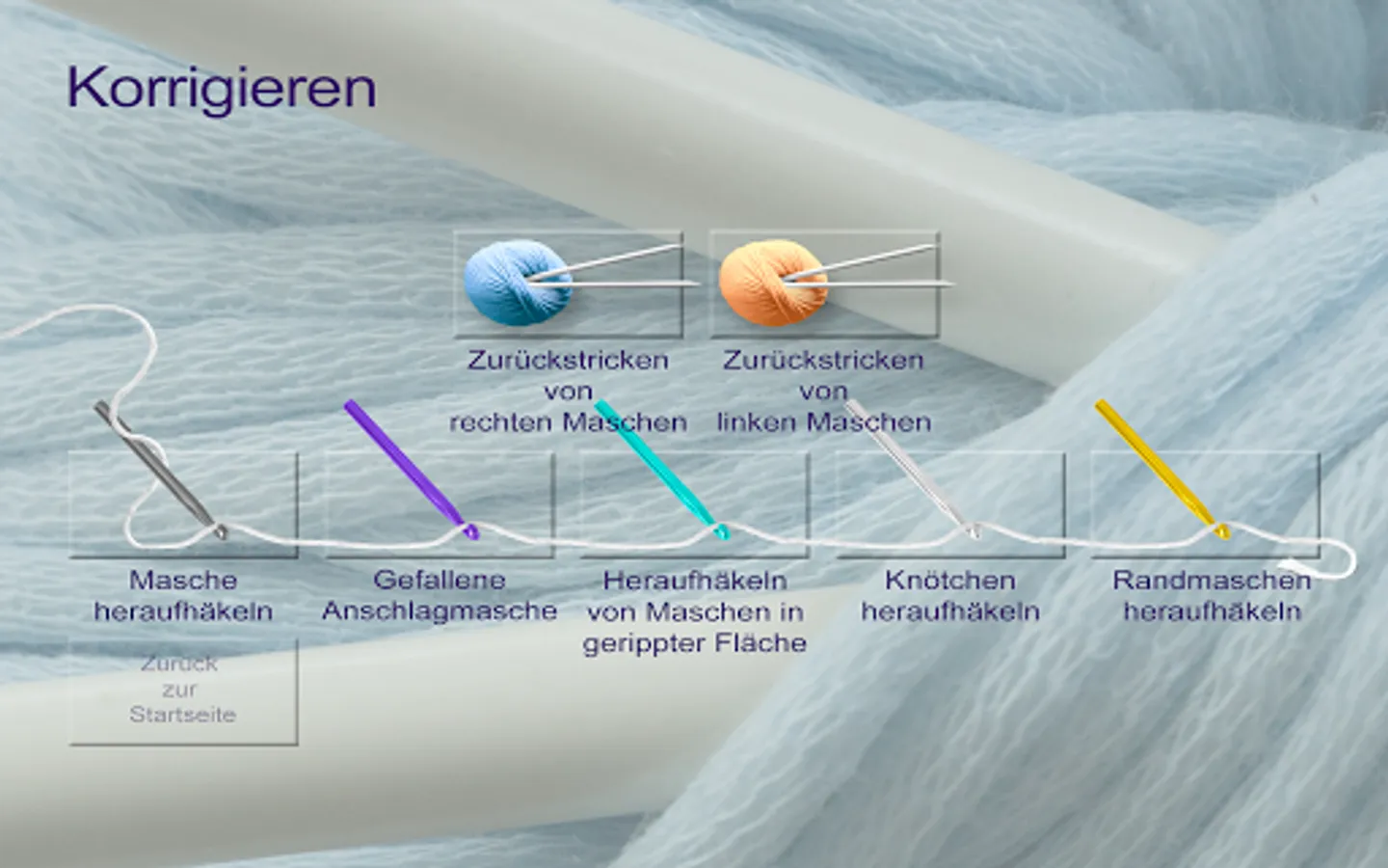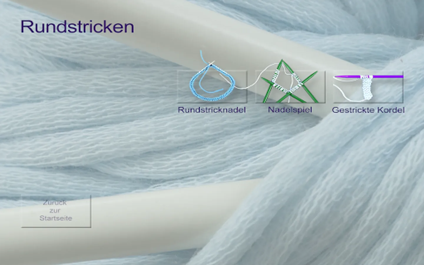 People familiar with the basic techniques can learn and repeat more sophisticated knitting techniques - see screenshots - individually and at their own pace.