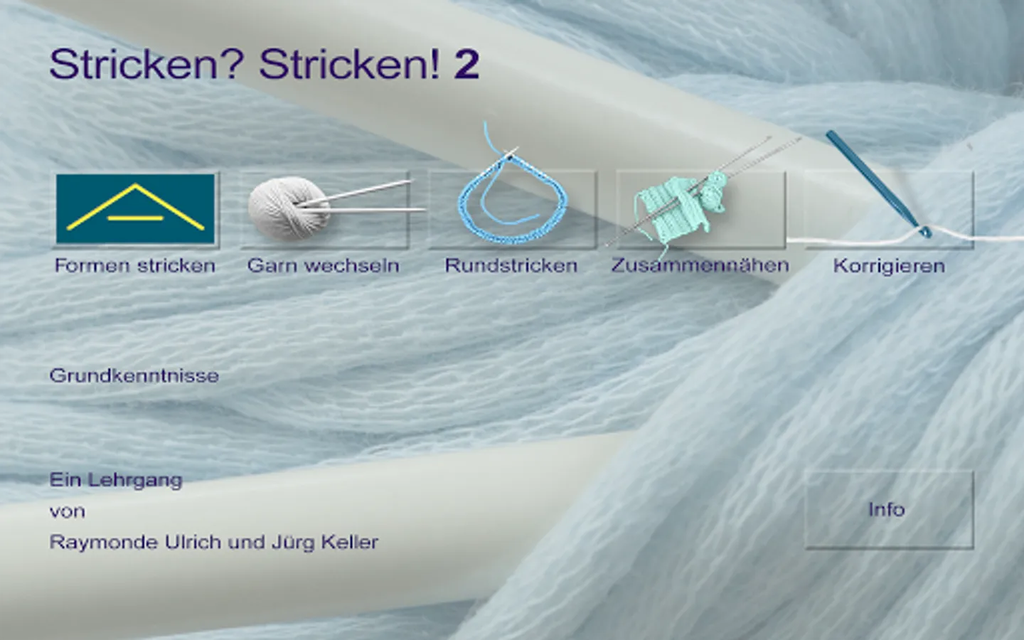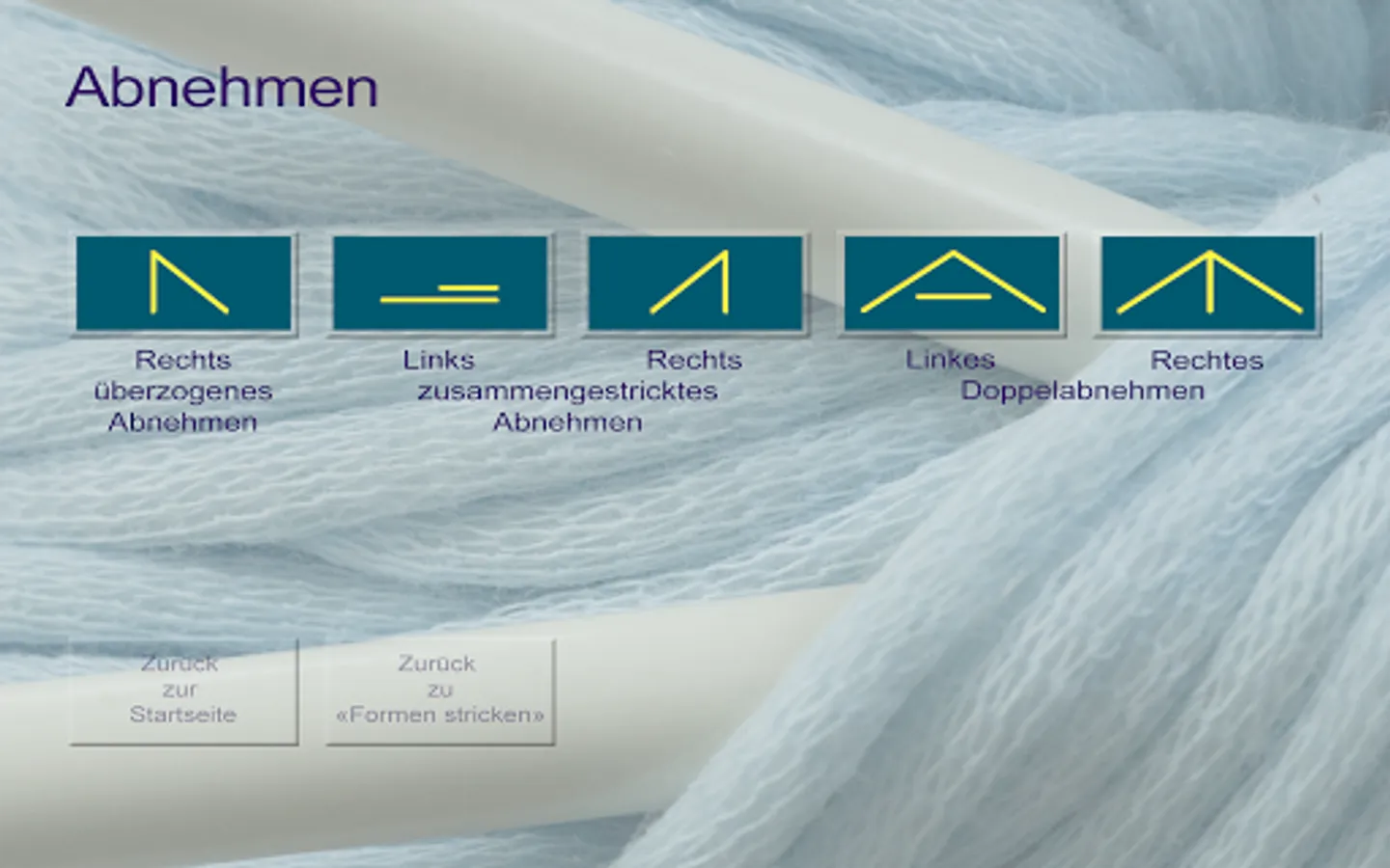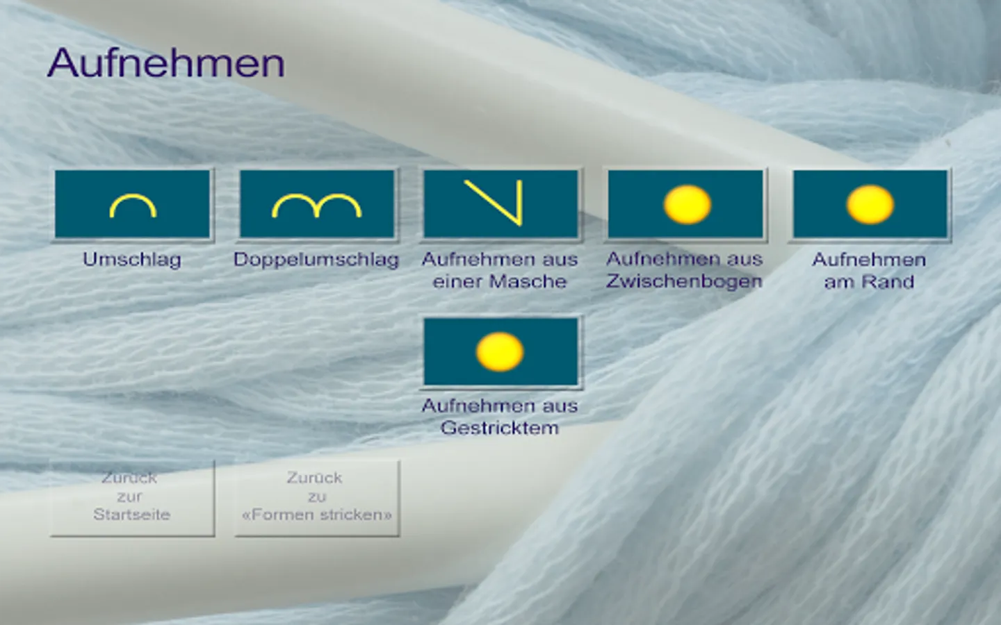 People familiar with the basic techniques can learn and repeat more sophisticated knitting techniques - see screenshots - individually and at their own pace.