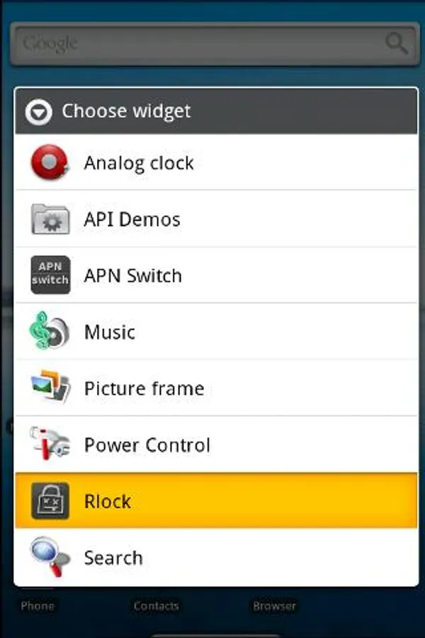 - Place the widget on your homescreen (Menu -> Add -> Widgets -> Rlock)