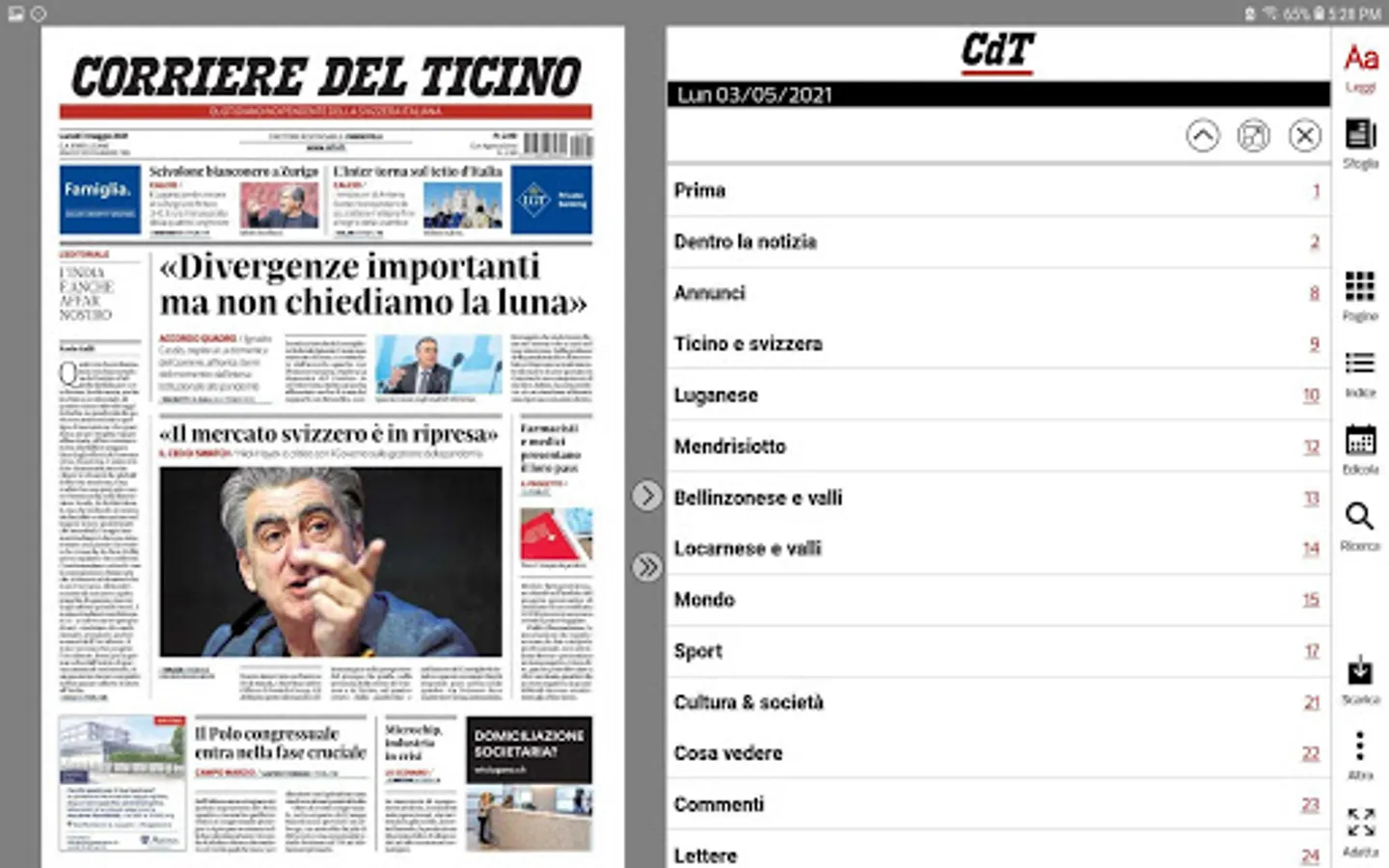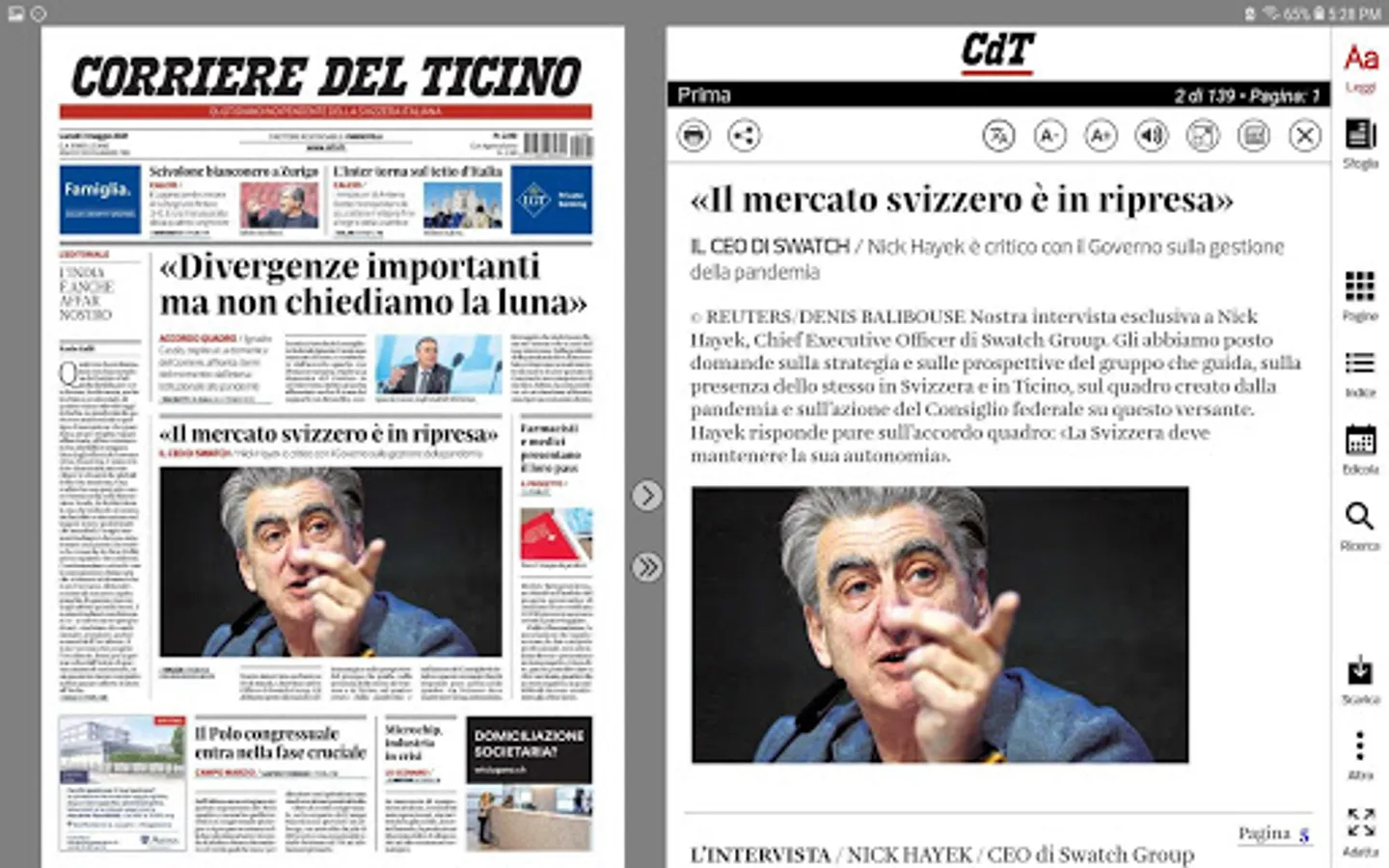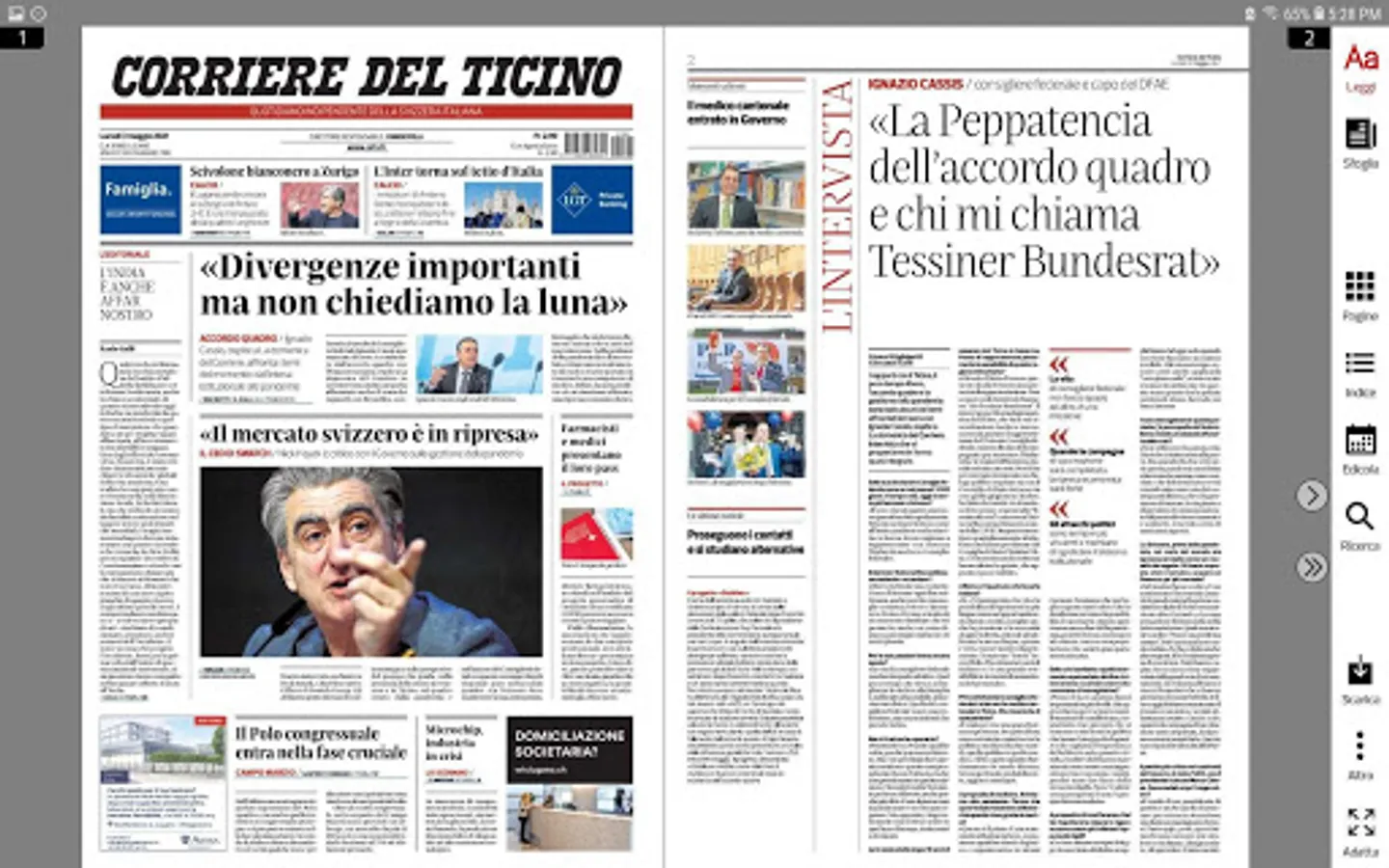 Reading the Corriere del Ticino you will discover the pleasure of leafing through your newspaper with a finger, enlarging the detail that interests you.