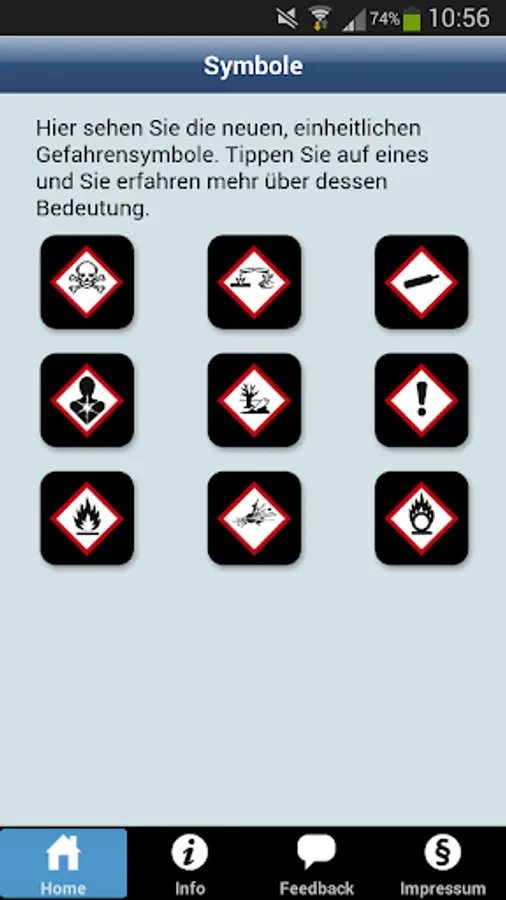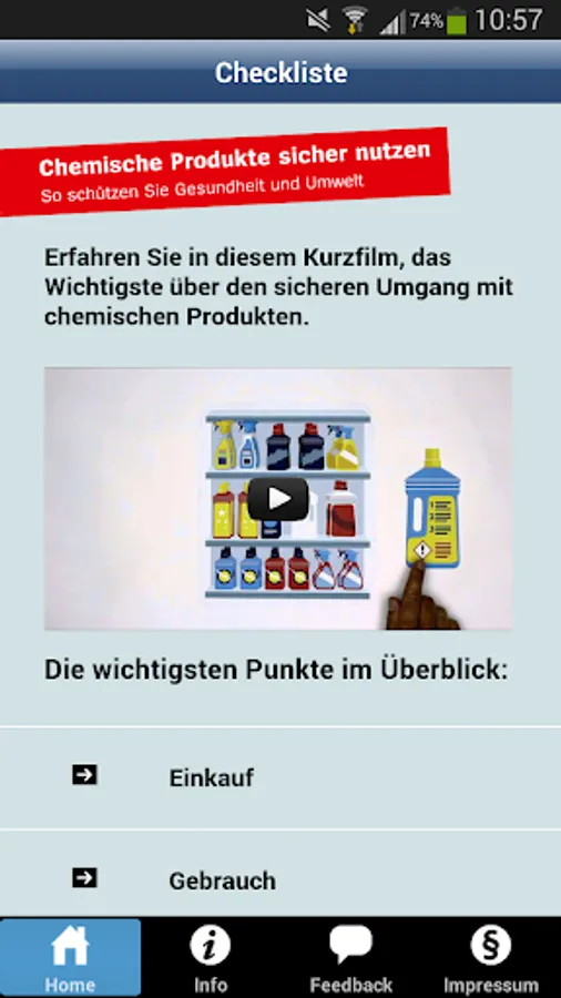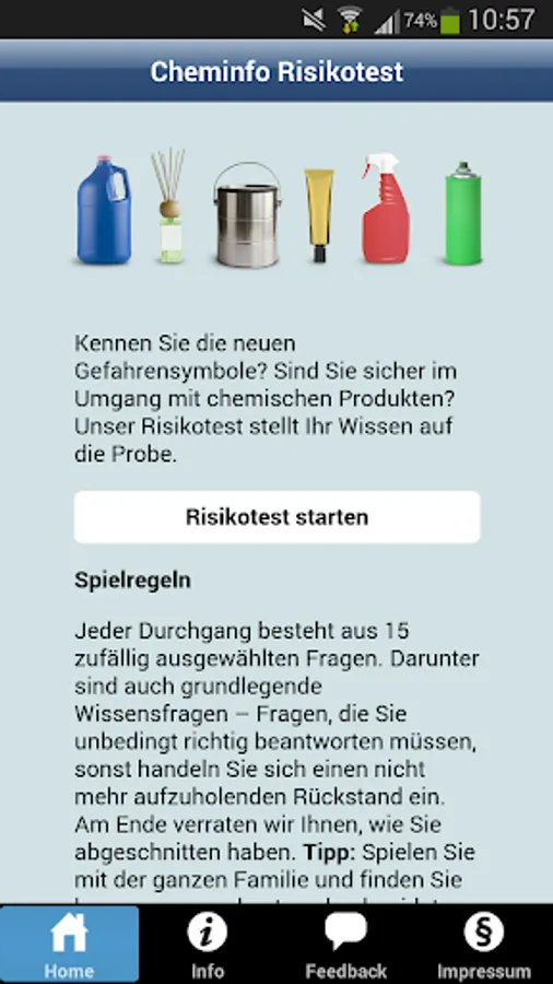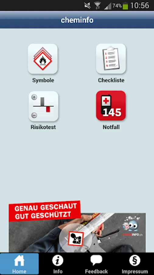 This mobile app from cheminfo.ch forms part of the campaign and is intended as an essential tool to help you in everyday life. The free app contains everything you need to know about the new hazard pictograms and handling chemical products. As well as offering explanations of the new hazard pictograms, it provides information about what to do in an emergency – including a direct dialling function for calling the emergency 145 number (the Swiss Toxicological Centre). The app has a checklist to help you when you are buying, using, storing or disposing of chemicals. As an exclusive feature it offers a risk test, with randomly selected questions designed to help people test their knowledge and make sure they know exactly what to do in future.