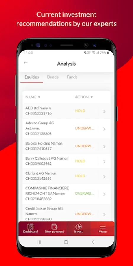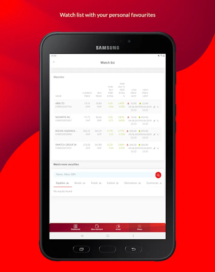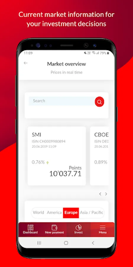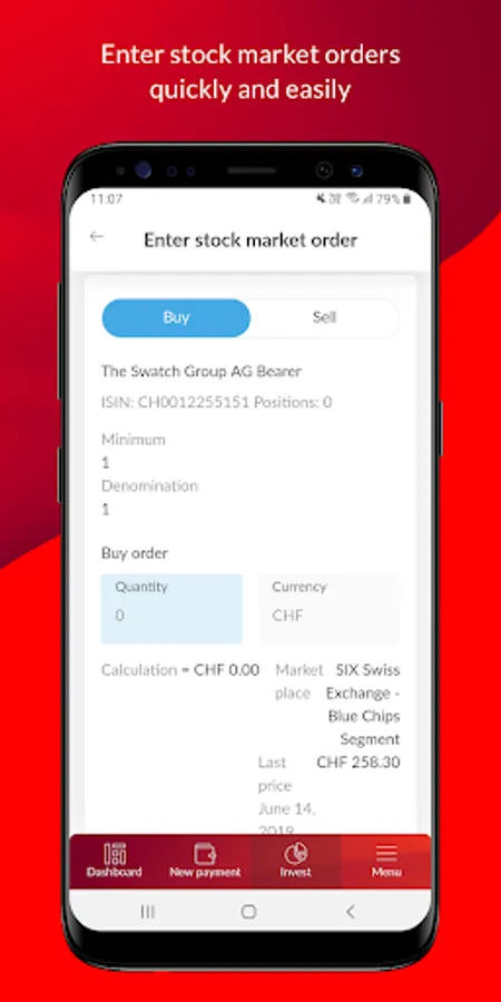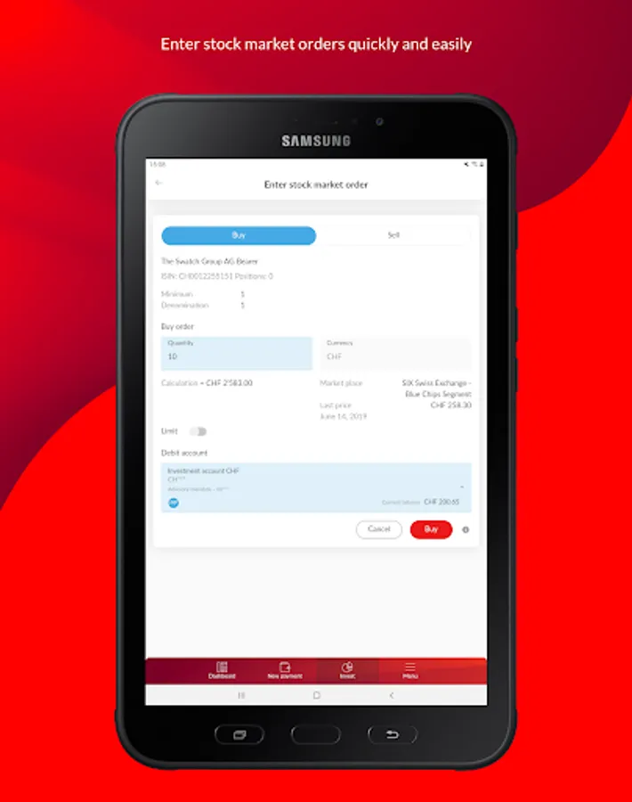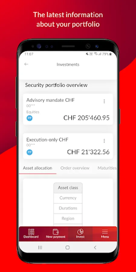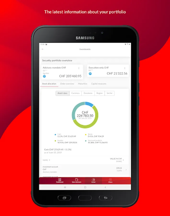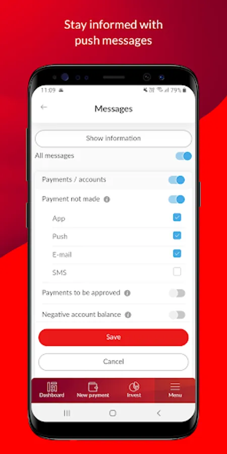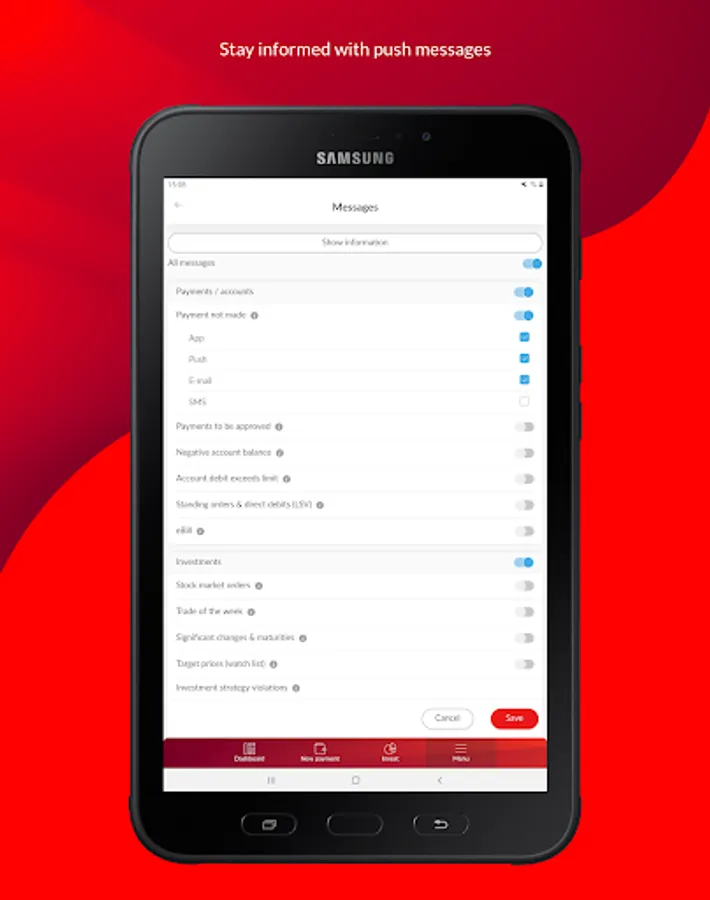 • Receive push messages on your smartphone or tablet, e.g. about account movements, eBills received, payments to be approved or stock market orders executed.