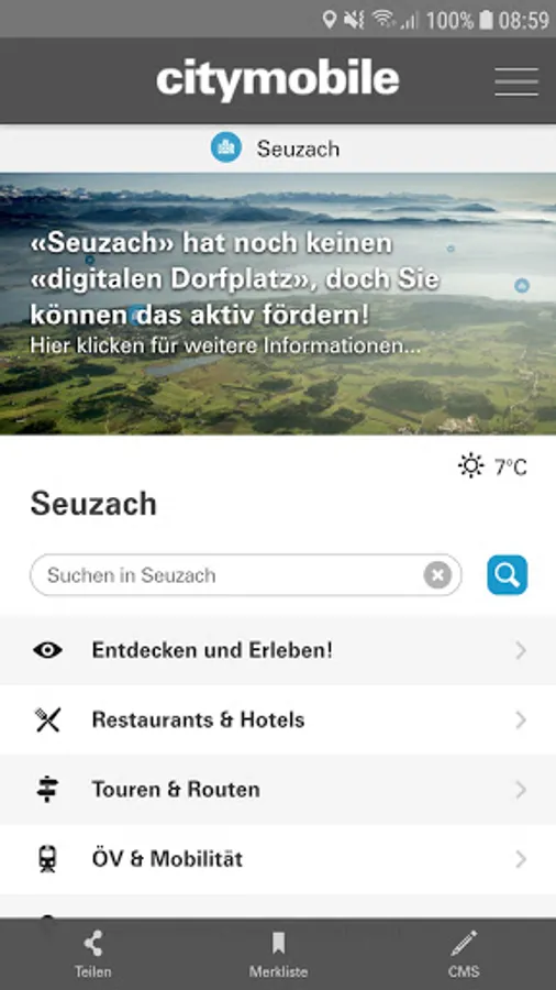Download the citymobile app now and get an overview of your community. If this has not yet activated a “portrait” or “community life”, you will already receive events, information about restaurants, hiking tours and interesting locations to discover and experience. You can also get public transport stops with a departure schedule and direct booking of tickets directly on your smartphone.