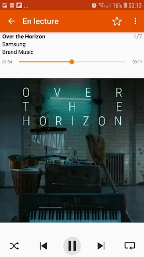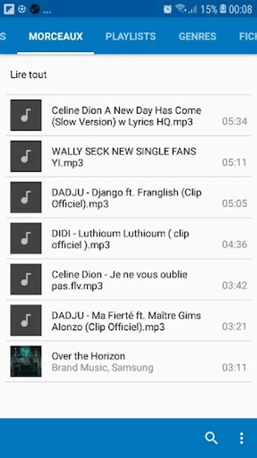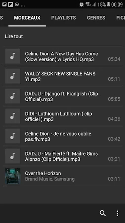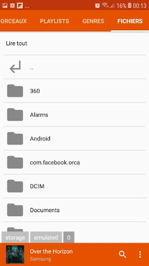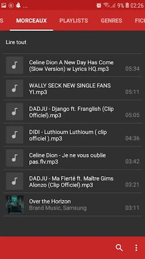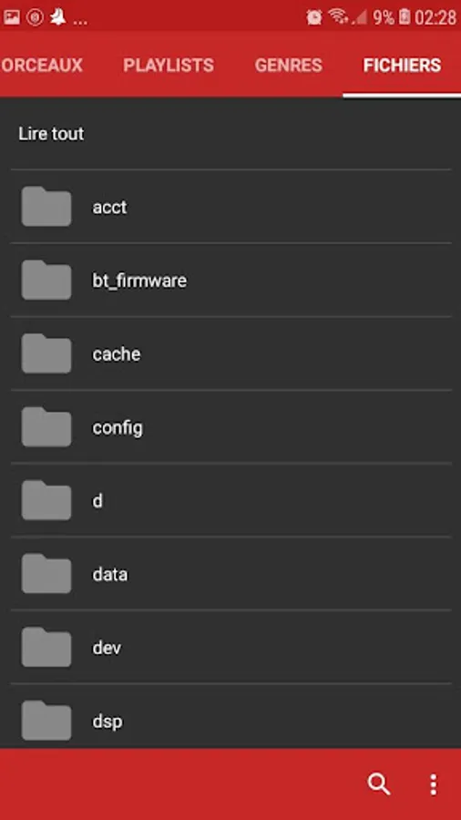 -6 menus: Artists, Albums, Songs, Playlists, Genre, and Files (which allows, from the application, to open audio files in your device.