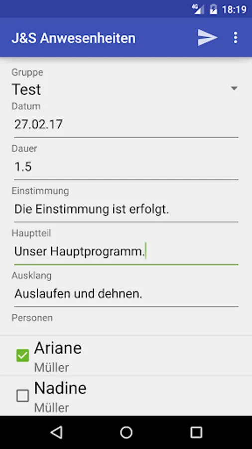 Enter the app the presence of registered participants of a course and send it to a coach, which can further process the information (eg in the Sportdb of J + S).