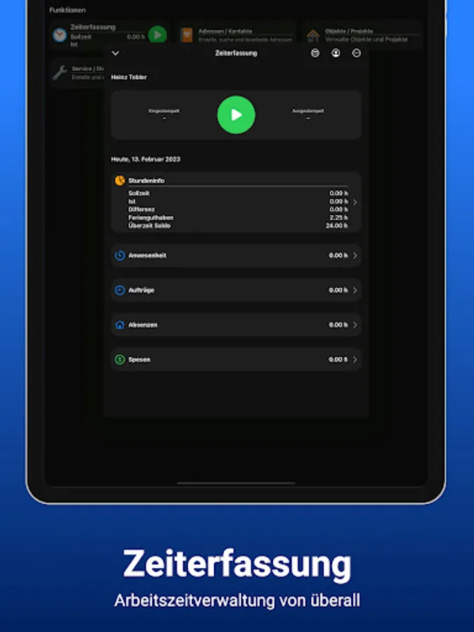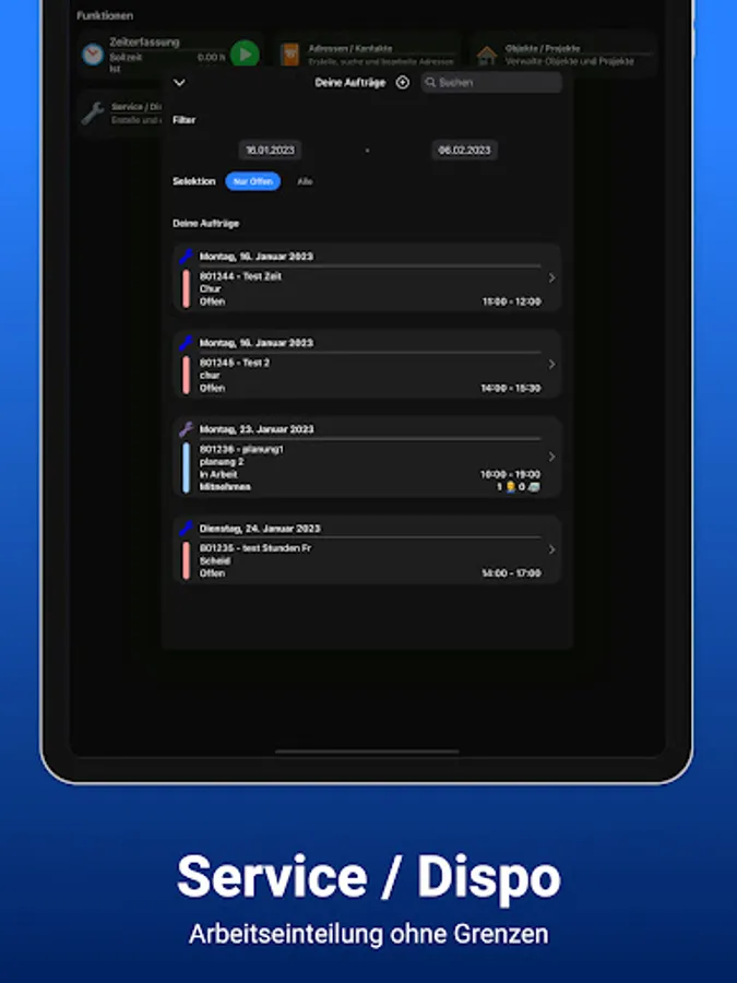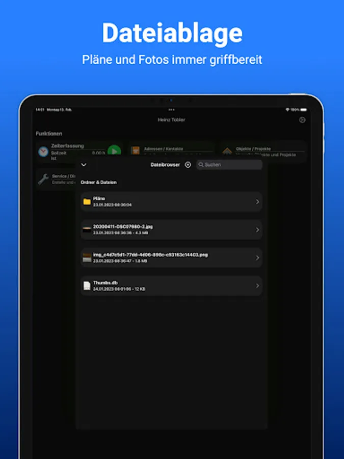 The object management helps you to keep track of all projects. You can create offers and invoices in just a few minutes with stored template documents. With the smartphone app, you not only have access to all the associated documents, but the fitters can keep track of the working hours thanks to the integrated time recording.