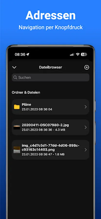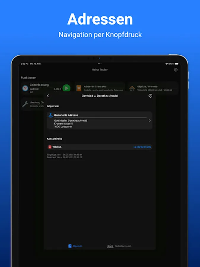 With just a few clicks you have recorded the contact details of the new customer, this can be done both via the PC and via the app on the smartphone. For customer visits, navigation can be started with one click.