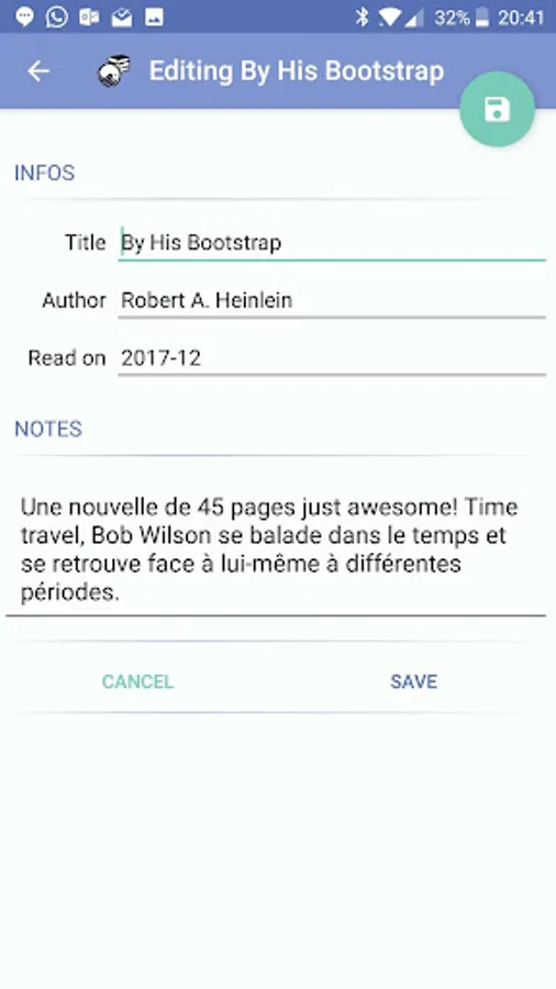 This is a very simple application that let's you store simple informations about what you read. The awesome part ? Everything is kept in a human-readable file in your Dropbox. So even away from your phone, those information are always safe and with you.