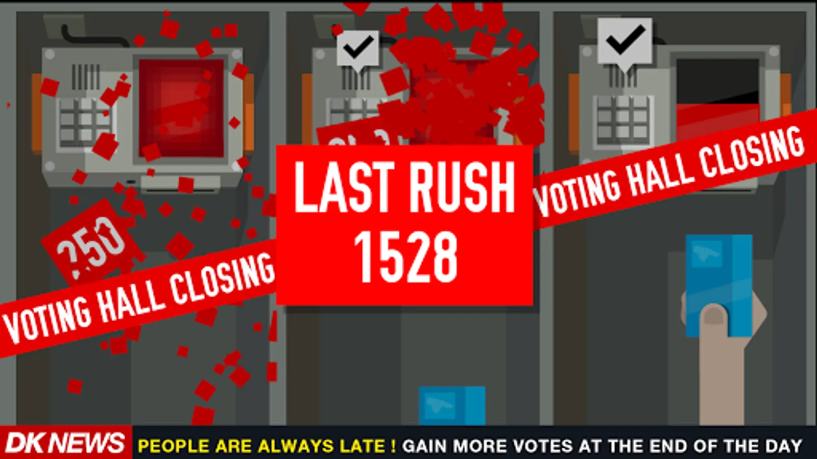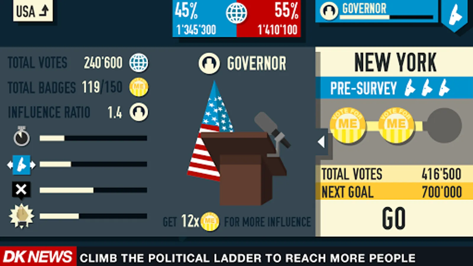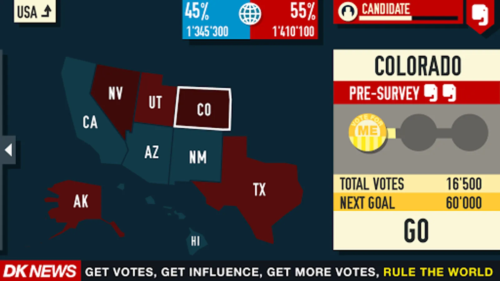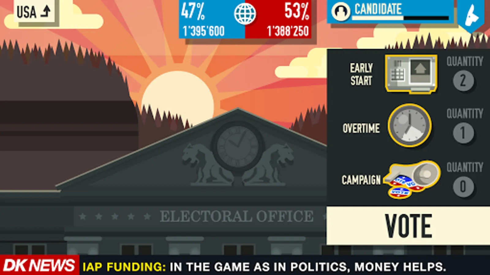 Are you a Democrat or a Republican ? Choose your party. Travel around the States and pop up in all electoral offices to gather more votes. Get famous friends, buy private funds or super PAC. Raise your campaign, cheat the election and rule the world.