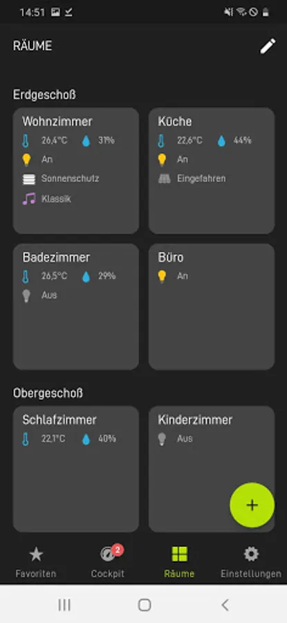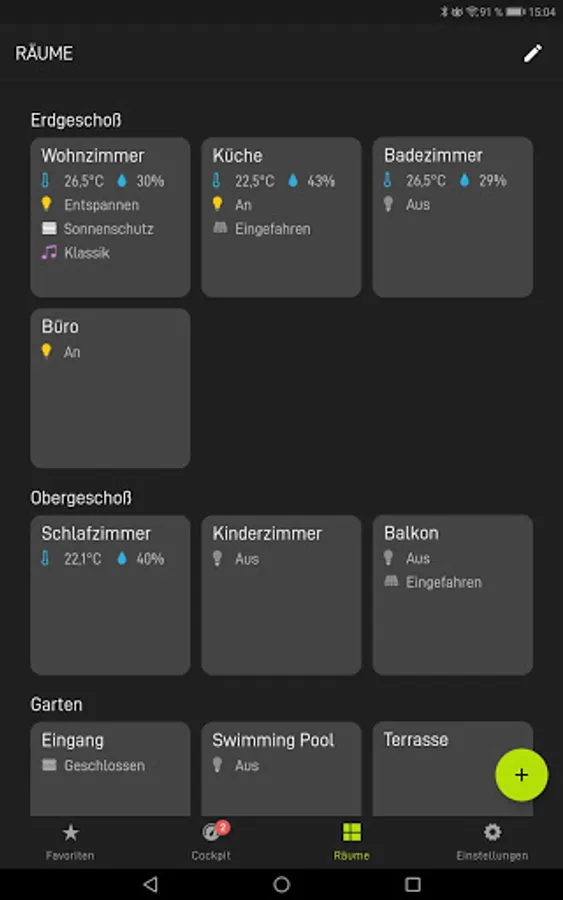 The app has four tabs (Favorites, Cockpit, Rooms, Settings) that help you to quickly switch between different features: