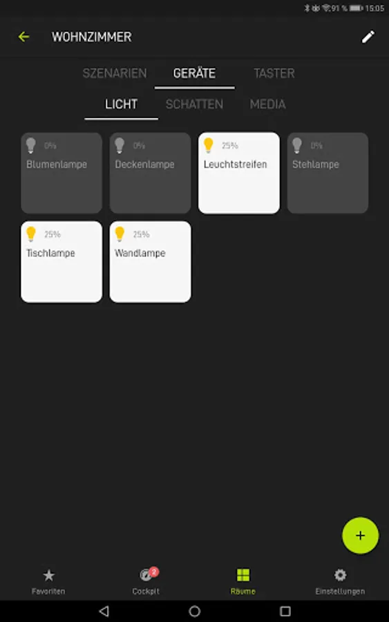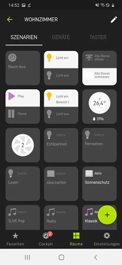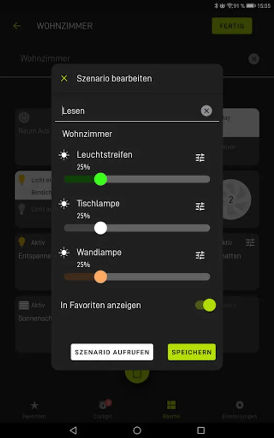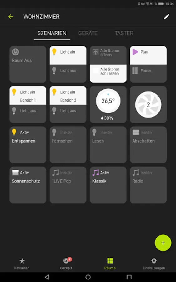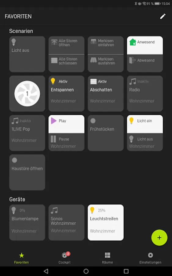 • Favorites: In the Favorites the most important scenarios of the whole flat are displayed. And you can add your personal favorites. These can be scenarios from the rooms, individual devices or user-defined actions.