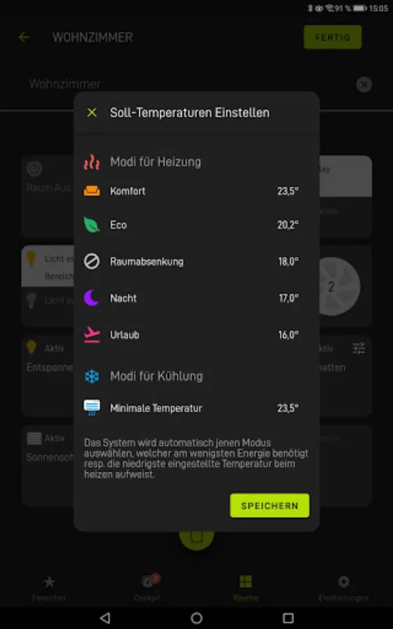 • Room overview: All rooms (including scenarios, devices and buttons) of your digitalSTROM Smart Home are displayed in the room overview and can be operated directly.