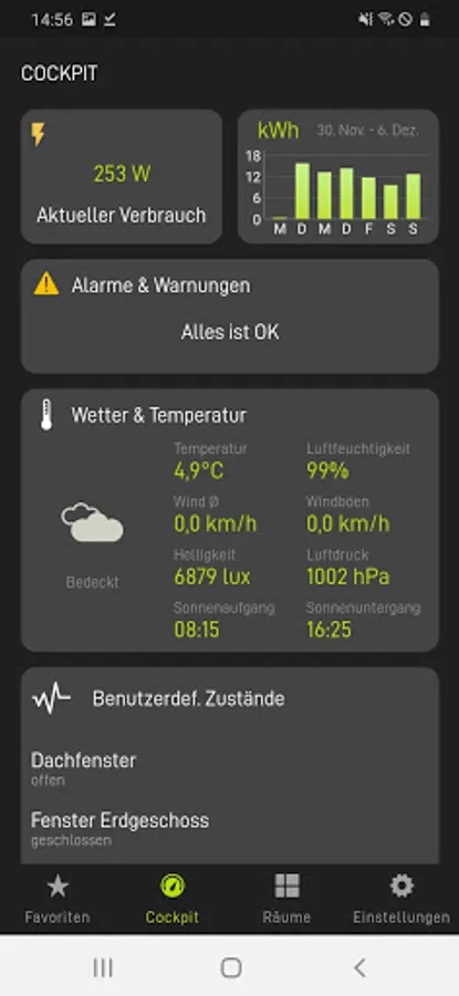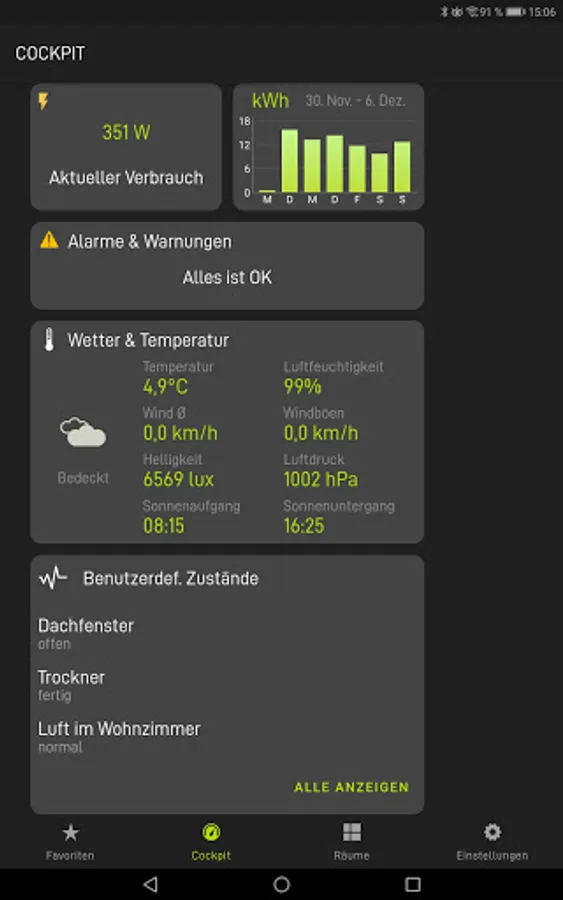 In the cockpit you will find information on current alarms and weather warnings, the user-defined states as well as the current energy consumption in your home.