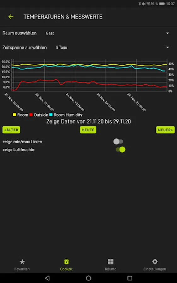 • Cockpit: the cockpit shows the current energy consumption and that of the last 7 days, weather and climate readings, current alarms and warnings, and user-defined states. In the detailed view of energy consumption, the individual circuits are displayed to the second. The climate data details show the temperature and humidity readings from the past days and weeks..