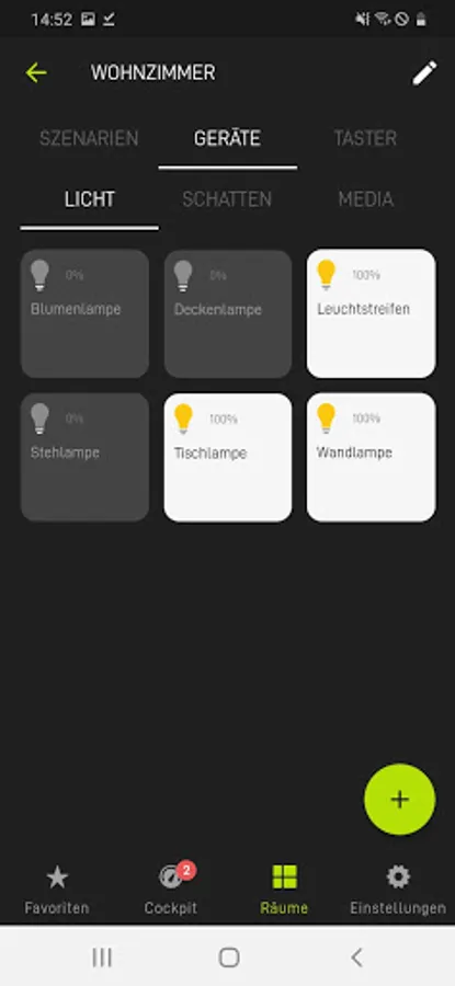 Check the different measured values (e.g. temperature or humidity) and the current state of scenarios and all devices for "light" and "shading" for every room of your digitalSTROM Smart Home. Any changes made are displayed in the app immediately.