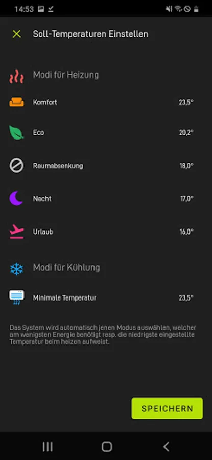 Check the current temperature in the rooms, choose between Comfort and Eco mode in each room and set the desired temperature for each mode and room.