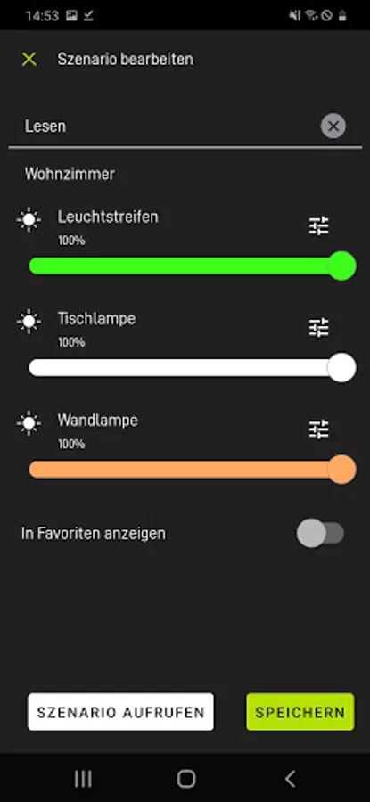 Adjust the current brightness or color of lights and the position of shutters, blinds or awnings at any time easily. With a long click (3D-Touch) on a scenario or device you can open the temporary settings and make adjustments.
