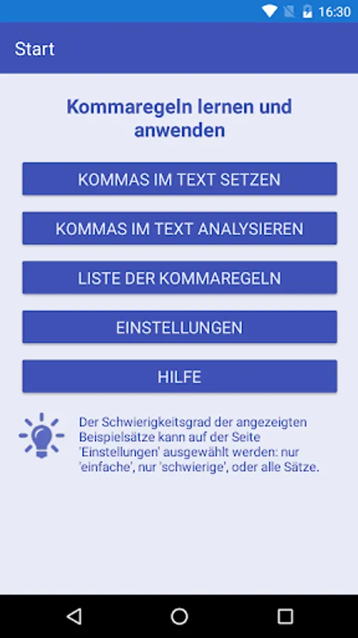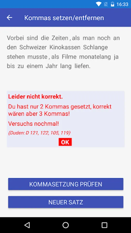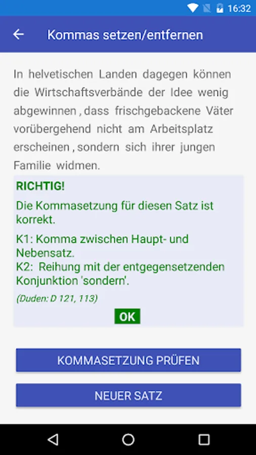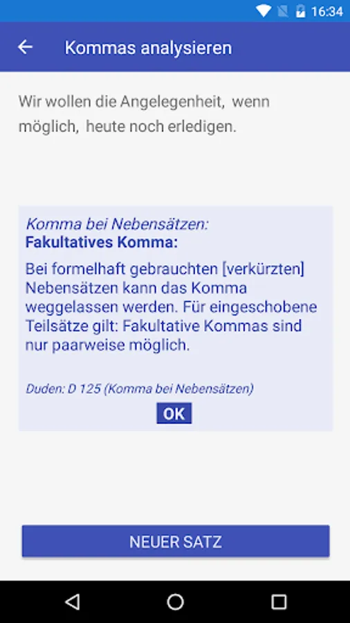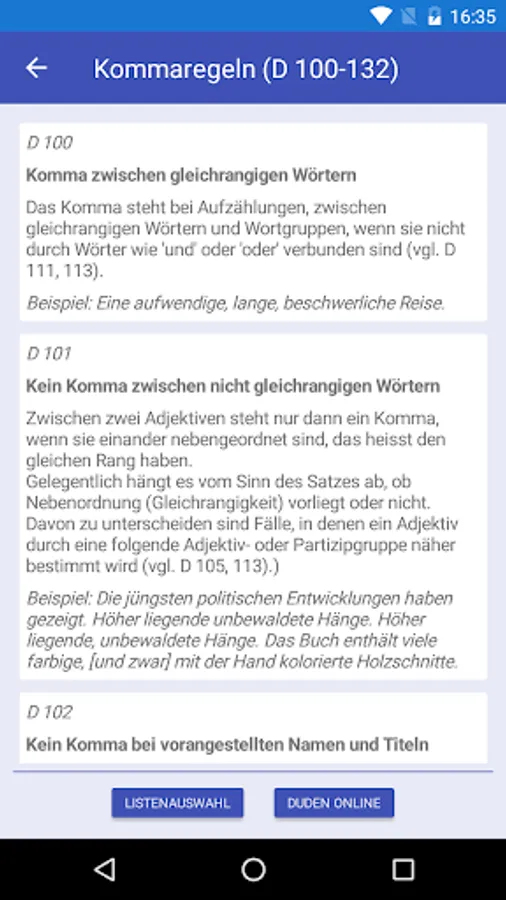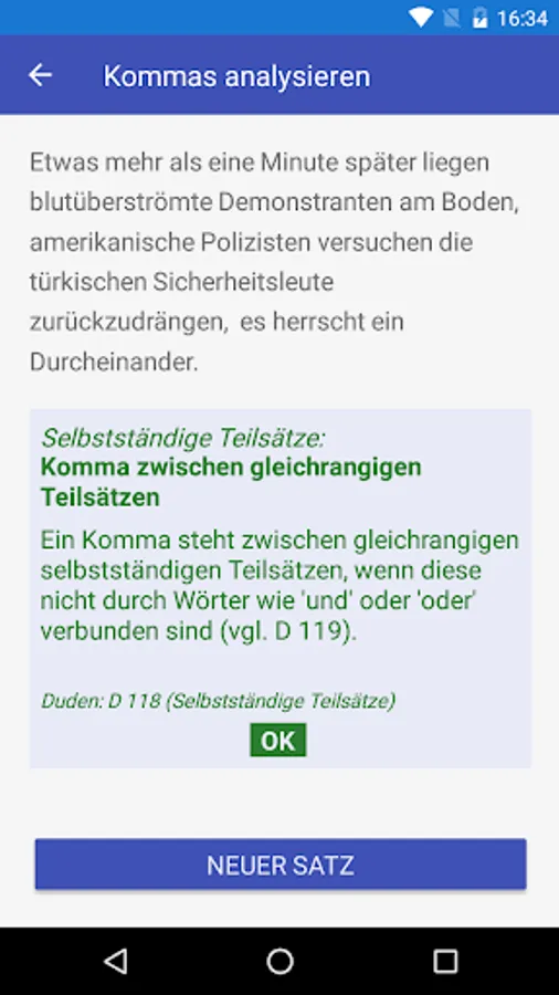 The sentences can also be displayed including commas. Clicking on the commas then displays the corresponding comma rule.