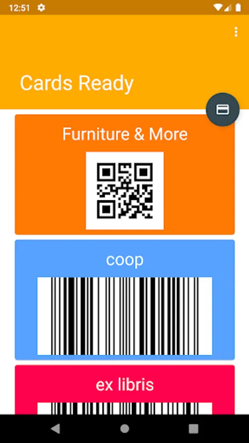 This app lets you scan bar codes to create virtual cards. It's designed to start blazingly fast, and if you add available WiFi networks to your cards where you use them, the card will be ready on top the next time it sees that network.