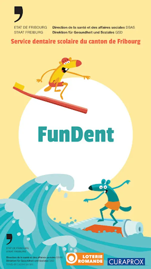 FunDent was developed by the School Dental Service of the Canton of Friborg (SDS) and supervised by a team of oral hygiene professionals. It was created in partnership with the Friborg directors Samuel and Frédéric Guillaume, the company DNA Studios and the singer Gaëtan.