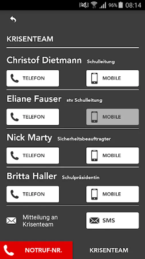 - Lists for emergency / crisis / event team / staff with telephone and alarm buttons