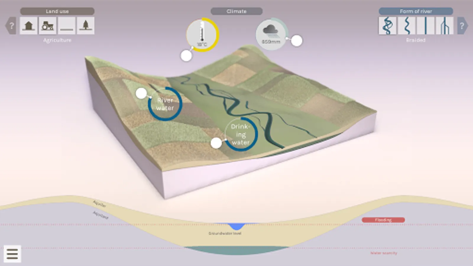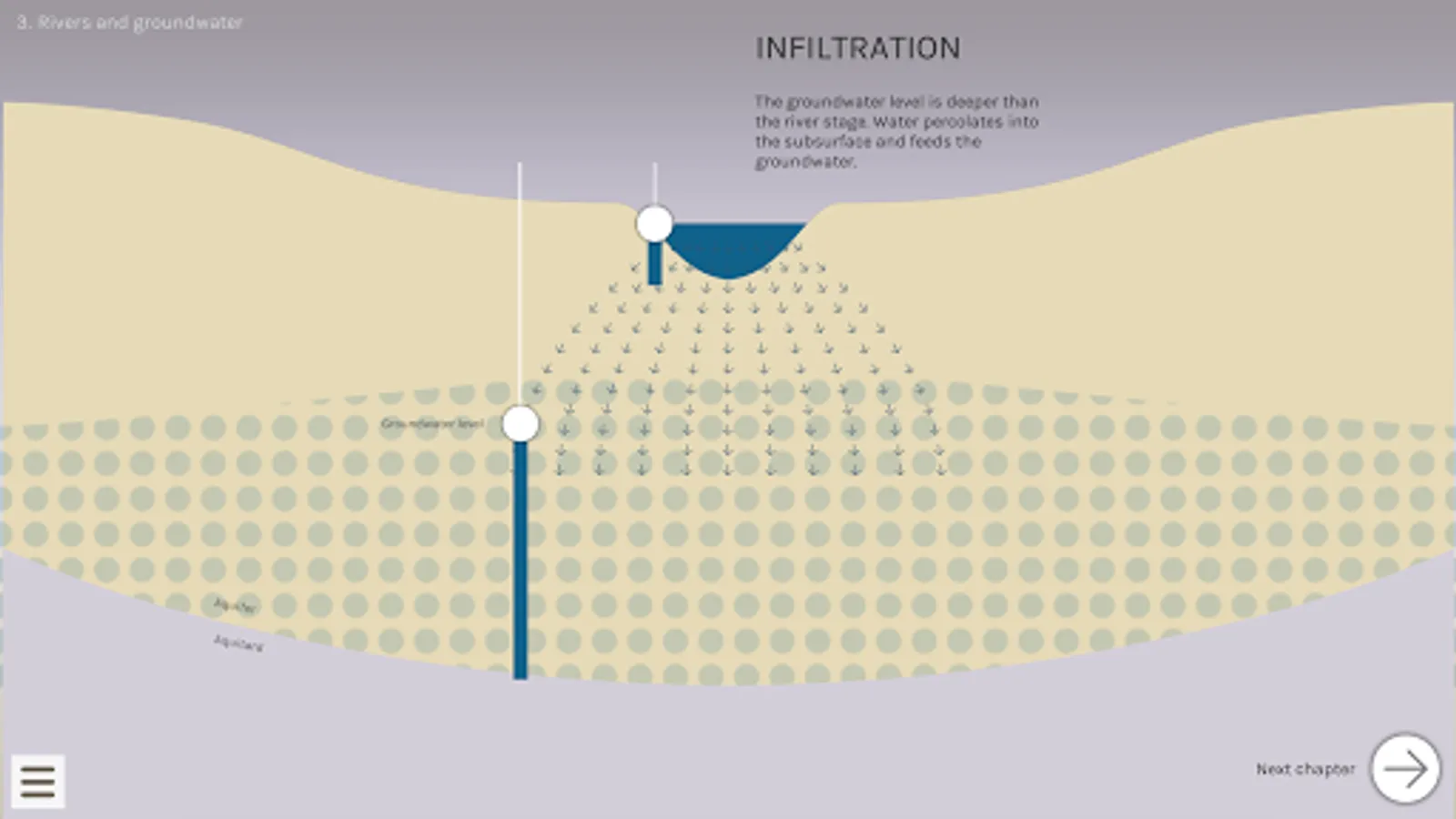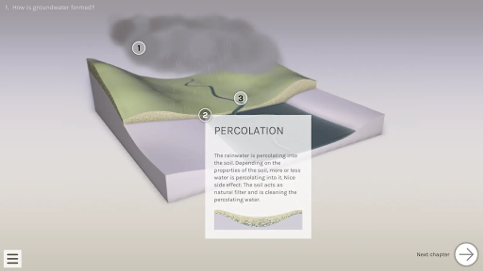 In three short chapters you learn, how groundwater originates, how we use it and why there is a link to rivers. Furthermore you can do experiments in the groundwater lab. Here you can increase your knowledge about the behavior of groundwater.