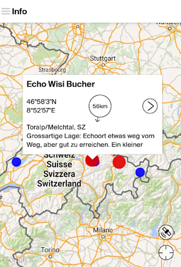 All reported Echo locations appear on the map as blue dots - the editors of ECHO TOPOS will verify one of them. Verified Echo places appear as red dots. But that's not all:
