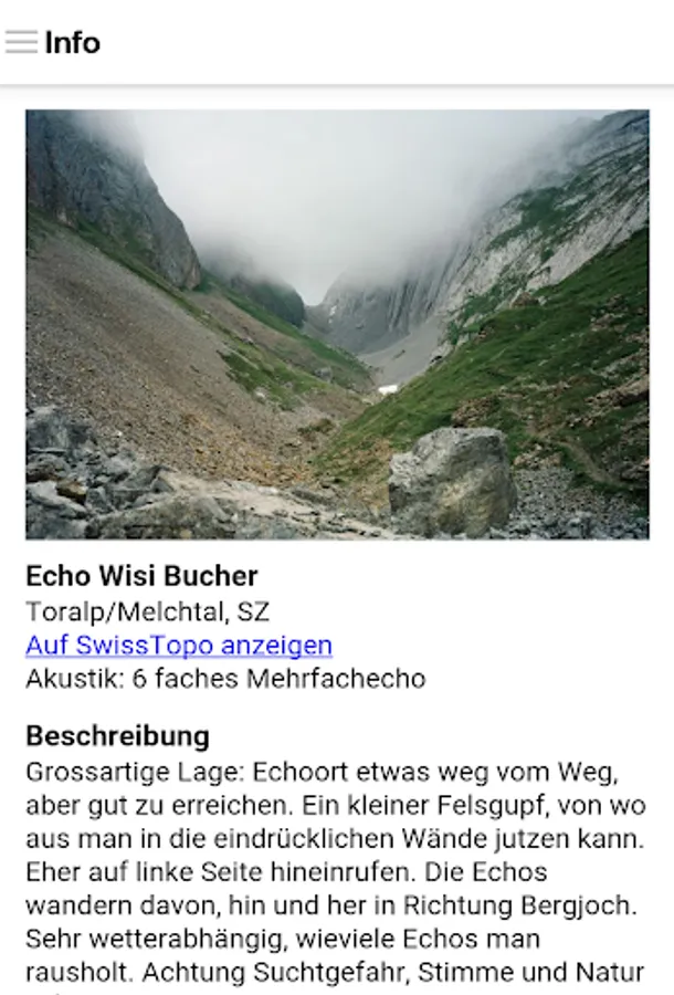 We call in mountains and valleys - the call returns as an echo. With you and App ECHO TOPOS Switzerland for the first time and creates a unique Echo map and an online archive echo our mountains. This app echoes can easily locate, report, search and find.