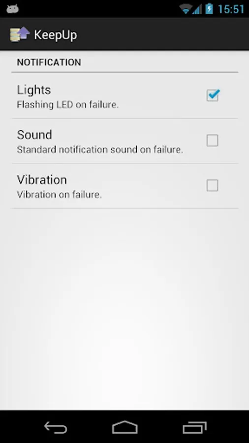 - failure notification (status bar, sound, vibration, lights)