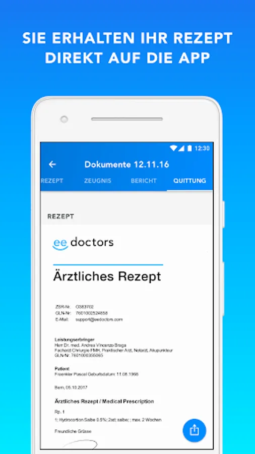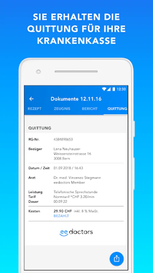 Immediately after the call, a recovery voucher for the Swiss health insurances will be sent to the smartphone. The voucher can easily be forwarded to Swiss health insurances. If you are on vacation, you can do this after your return.