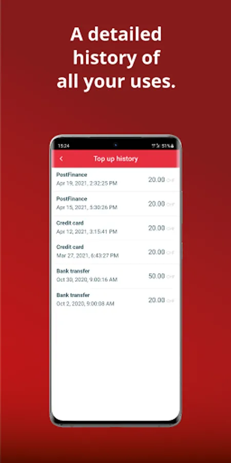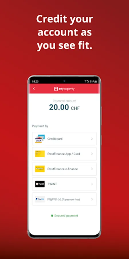 From your smartphone, you can top up your user balance by the following means: credit card (Visa, MasterCard, American Express, UnionPay), e-banking, PostFinance, TWINT, PayPal or by QR-bill.