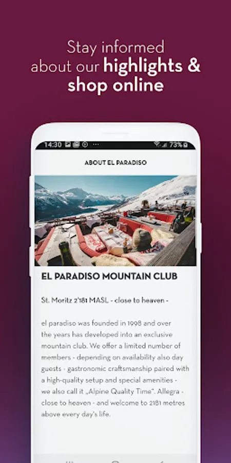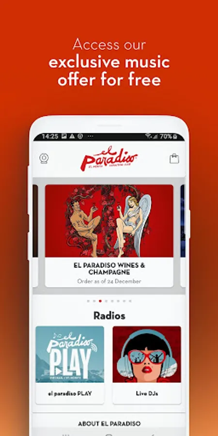Our app is the digital playground to our location and offers two exclusive and high quality radio channels. "el paradiso Play" is your soulful music radio "close to heaven" and "el paradiso Live DJs“ plays all DJ sets and live recordings from our mountain club - "where devils meet angels".